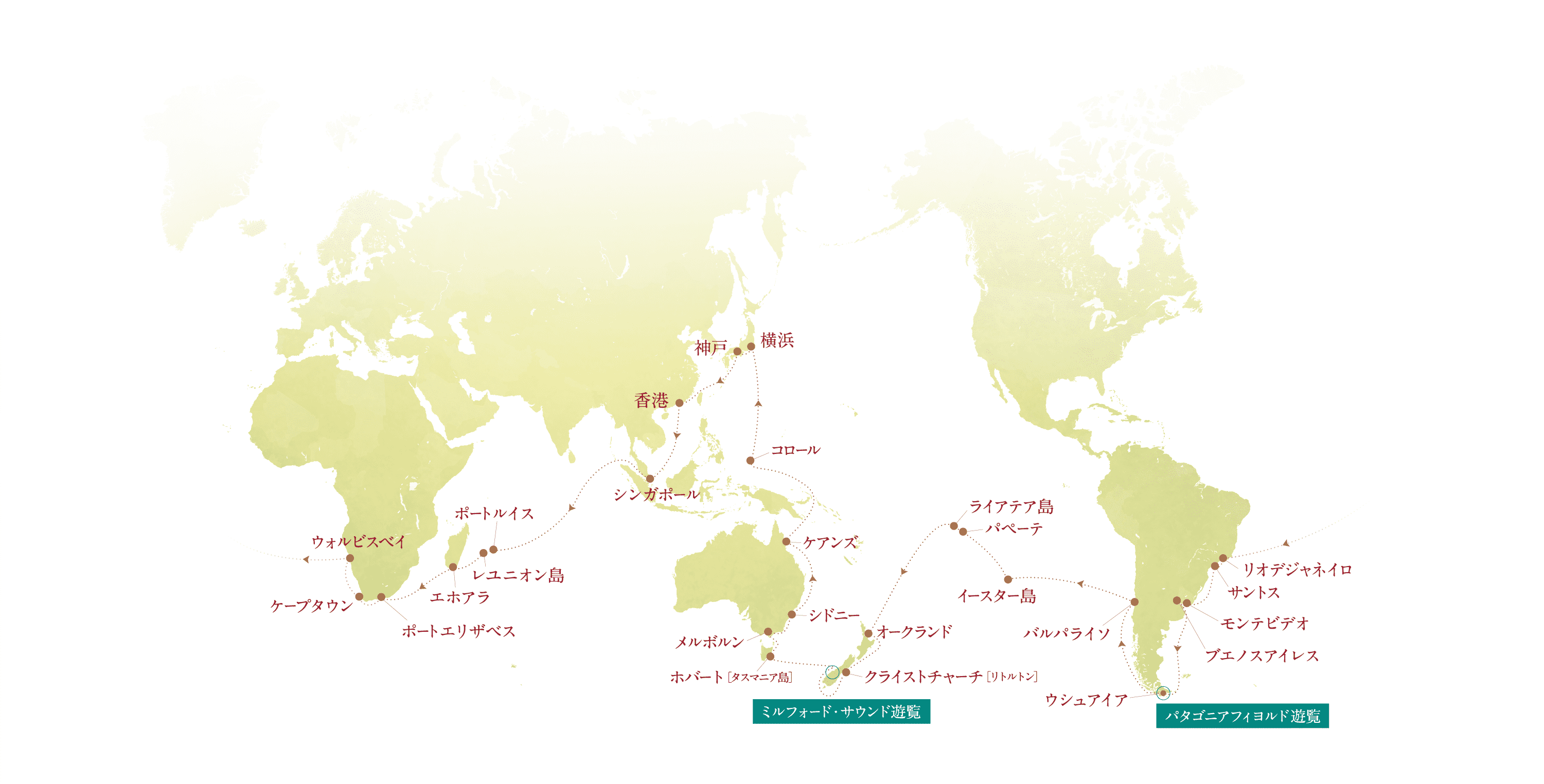 神戸 → 横浜 → ホノルル[オアフ島](米国) → カフルイ[マウイ島](米国) → カイルア・コナ[ハワイ島](米国) → パペーテ(タヒチ) → イースター島(チリ) → カヤオ(ペルー) → バルパライソ(チリ) → パタゴニアフィヨルド遊覧 → プンタアレナス(チリ) → ウシュアイア(アルゼンチン) → プエルトマドリン(アルゼンチン) → ブエノスアイレス(アルゼンチン) → モンテビデオ(ウルグアイ) → サントス(ブラジル) → リオデジャネイロ(ブラジル) → ウォルビスベイ(ナミビア) → ケープタウン(南アフリカ) → ポートエリザベス(南アフリカ) → エホアラ(マダガスカル) → レユニオン島 → ポートルイス(モーリシャス) → シンガポール → 基隆(台湾) → 神戸 → 横浜
