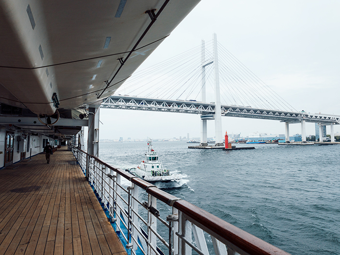 出港の時を告げる汽笛がなり響き、ゆっくりと岸壁から離れていく船。船とターミナルを行き交う「行ってきまーす」、「行ってらっしゃーい」という声が、次第に遠ざかっていきます。さあ、いよいよ夢にみた世界一周の旅がはじまります。そのスタートラインとなるのは、横浜港にかかるベイブリッジ。世界一周を終える日には、ここがゴールラインへと変わります。