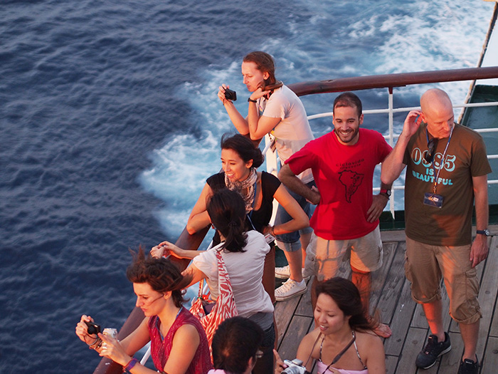 3ヶ月という、短いようで長いクルーズでの旅時間は、何かを身につけたり、深めたり、新しいチャレンジをするのに最適です。バックグラウンドのさまざまな人が集うピースボートクルーズの言葉や文化が緩やかに混じり合った空間は、国際色豊かで刺激ある日々です。日本語を中心にさまざまな言語が飛び交う環境では、発音がわるいとか、単語を知らないなど語学力を気にする必要はありません。「伝えたい」という気持ちが伝わるように、目の前の相手と心を通わせられるように――いつもよりもほんの少し前に出てコミュニケーションをとることで、開かれた窓からは未知の景色が見えてきます。
