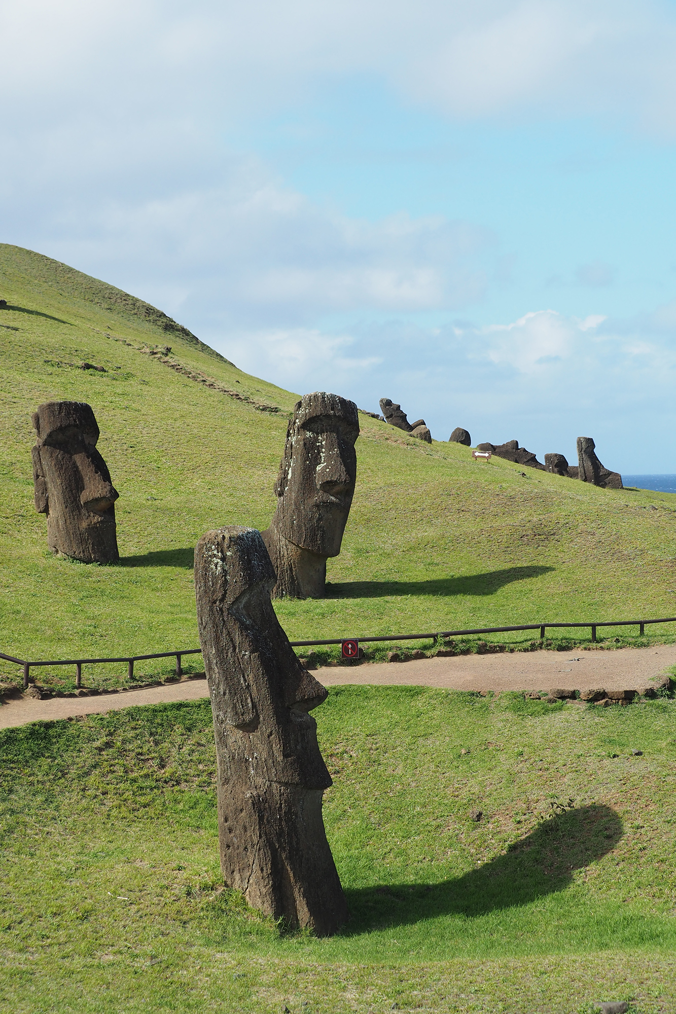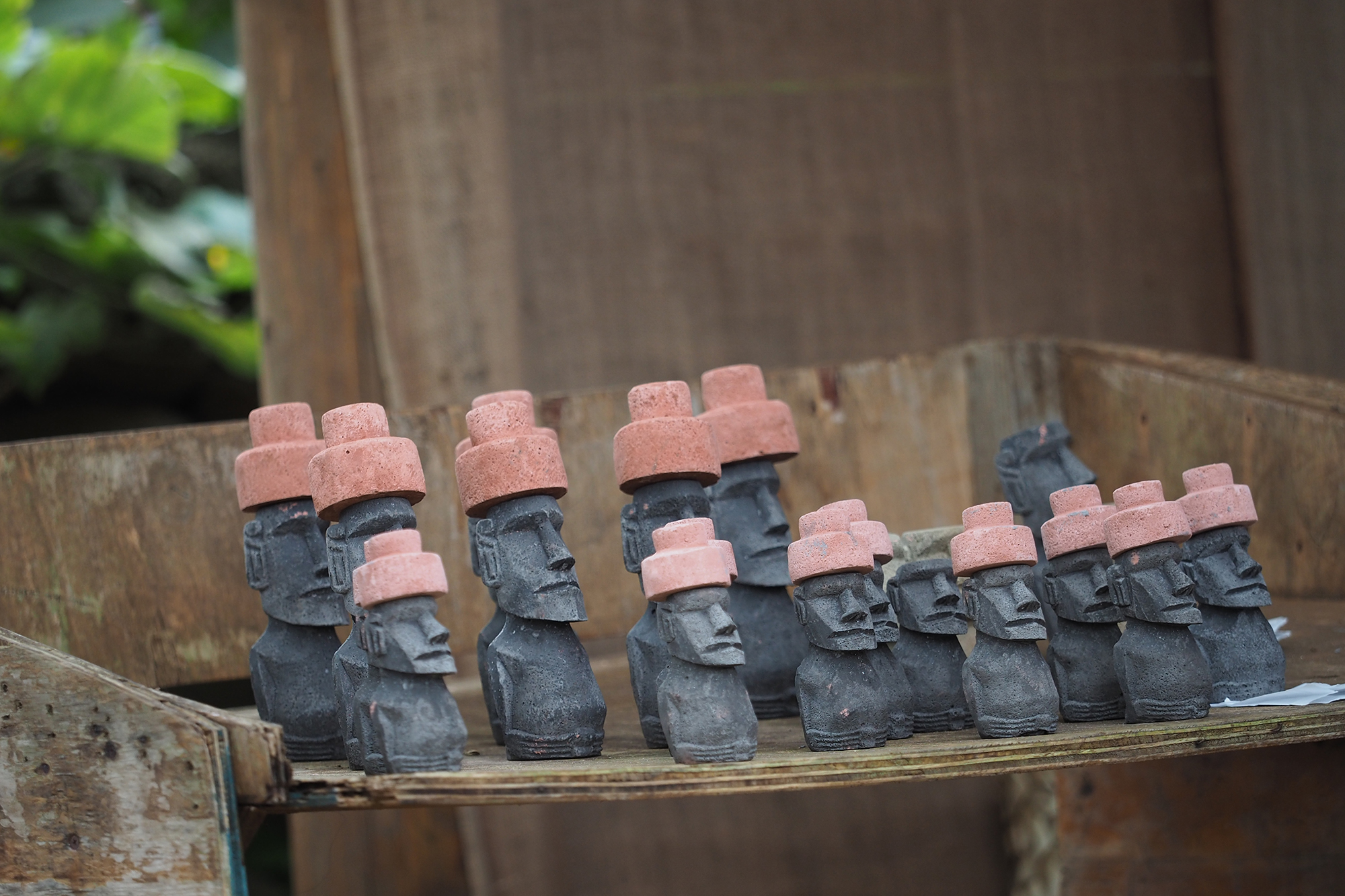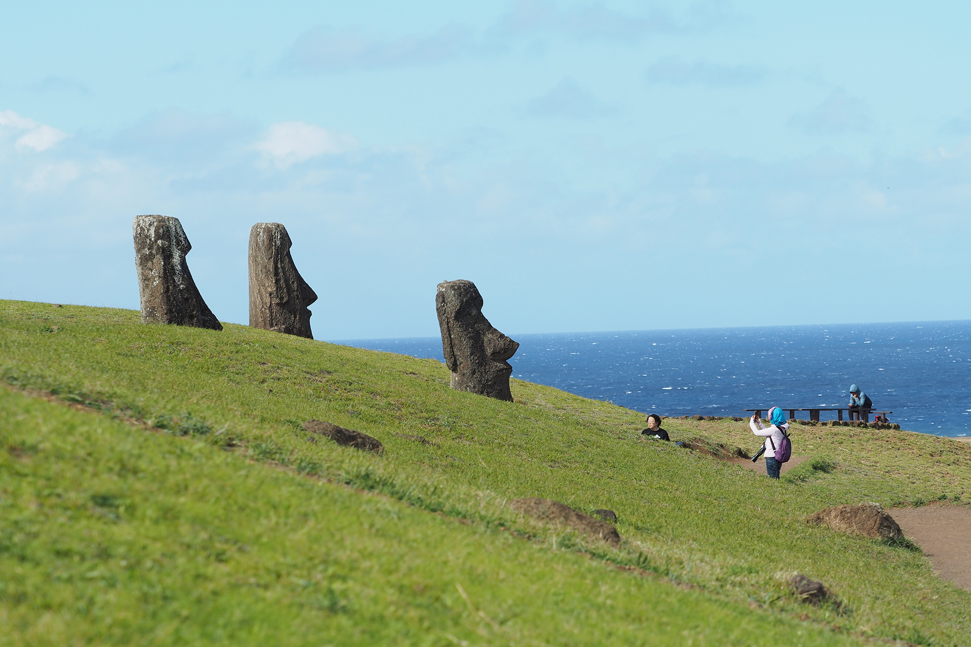 大多数のモアイ像がここから削り出されたことから、「モアイ製造工場」と呼ばれるラノ・ララク。ここでは、胸のあたりまで土に埋れているもの、岩から削られている途中のものなど、この場所ならではのさまざまなモアイ像と出会えます。高さ10メートルにもなるモアイを1体完成させるには、30人が1年以上かけて作業に励んだのだとか。この一帯には、そんなモアイ像がおよそ400体も残されています。 ラノ・ララクの周囲をぐるっと回ると現れるのが、「モアイ・トゥク・トゥリ」と呼ばれる島で唯一の座ったモアイ像。正座をするように座るフォルムは、どことなく親近感を感じさせます。