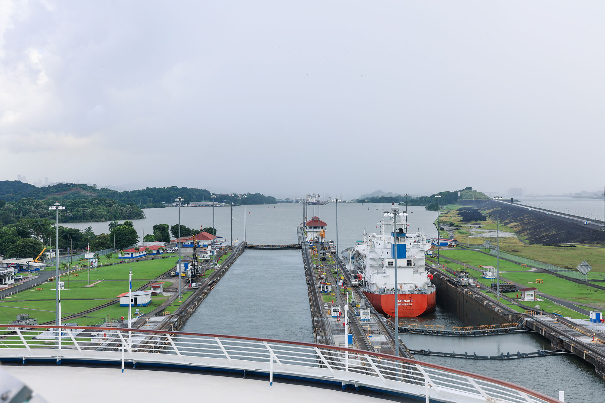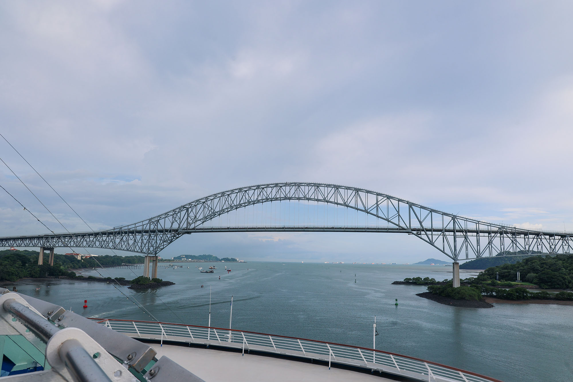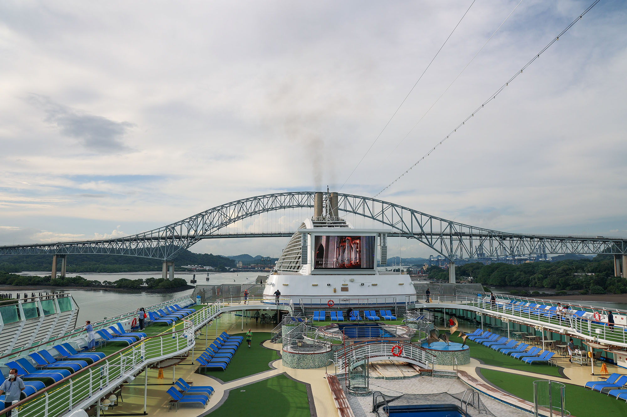 大西洋と太平洋をつなぐ、パナマ運河通航の日。水位が上がり閘門が開くたび、デッキからは「すごい」という声があがります。
