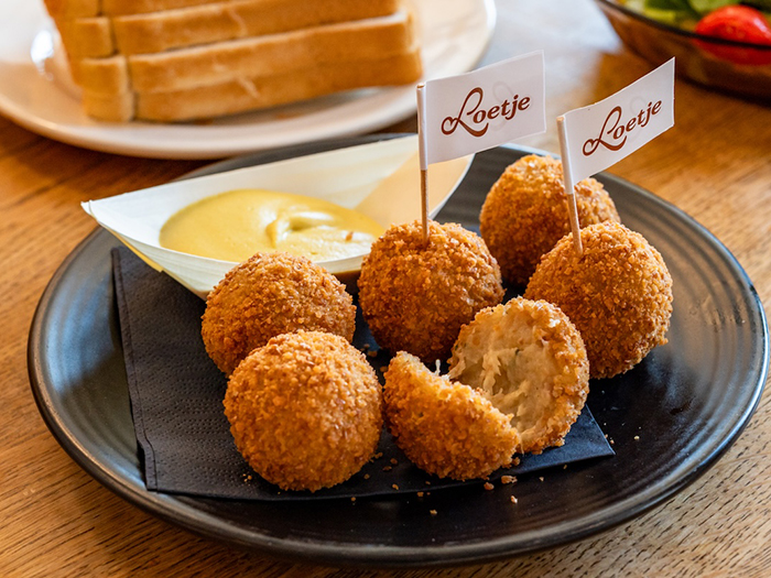 オランダ料理の特徴は、肉や野菜の煮込みや、魚介などの新鮮な食材をそのまま使ったメニューが多いこと。街歩きをしながら気軽に味わうことのできる軽食も豊富で、ニシンの塩漬けにタマネギをのせた「ハーリング」や、牛肉とブイヨン、スパイスが入ったルーを丸めてカリッと揚げたコロッケ「ビターバレン」などがその代表です。酪農大国オランダでは、牛乳やチーズ、バターなどの乳製品が多用されているのも特徴。食後のデザートには、薄く焼いたワッフル生地の間に温かいシロップ(ストロープ)を挟んだ「ストロープワッフル」もおすすめです。