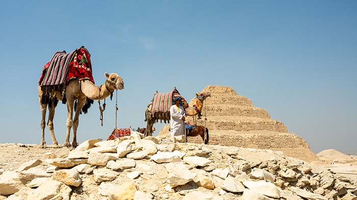 カイロ市街から南西へ向かうと、近代的な街並みの向こうにあのピラミッドの姿が見えてきます。テレビや写真で何度も観てきた憧れの世界遺産が、目の前にそびえ立つ喜びと不思議――。想像を超える大きさと建築精度の高さは、実物を前にするとより実感できます。さらには、その傍らに建つ巨大な石像・スフィンクスも、一枚の岩山から彫りだされたというから驚きです。クフ、カフラー、メンカウラーの三大ピラミッド、そしてスフィンクスが鎮座するギザの地は、4,500年の時を超えて訪れる人びとに、古代エジプトが抱く謎を投げかけ続けています。