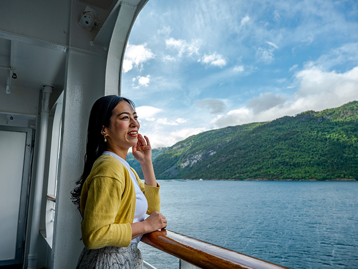 フィヨルドの遊覧中は、船に乗りながら自然や景色を堪能できる「シーニック・クルーズ」が楽しめます。船の右手に緑に染まる山々が現れたかと思うと、前方には氷河を抱いた険しい峰がそびえる――船のデッキを自由に行き来しながら、あちこちでフィヨルドの姿を目に焼きつけることができます。さらには、船室のバルコニーや船内の窓から眺めるフィヨルドも格別の美しさ。クルーズという日常を楽しみながら、フィヨルドという非日常を体験できる優雅なひととき――時間の流れに逆らわず、ゆっくりと時を刻むクルーズならではの体験です。