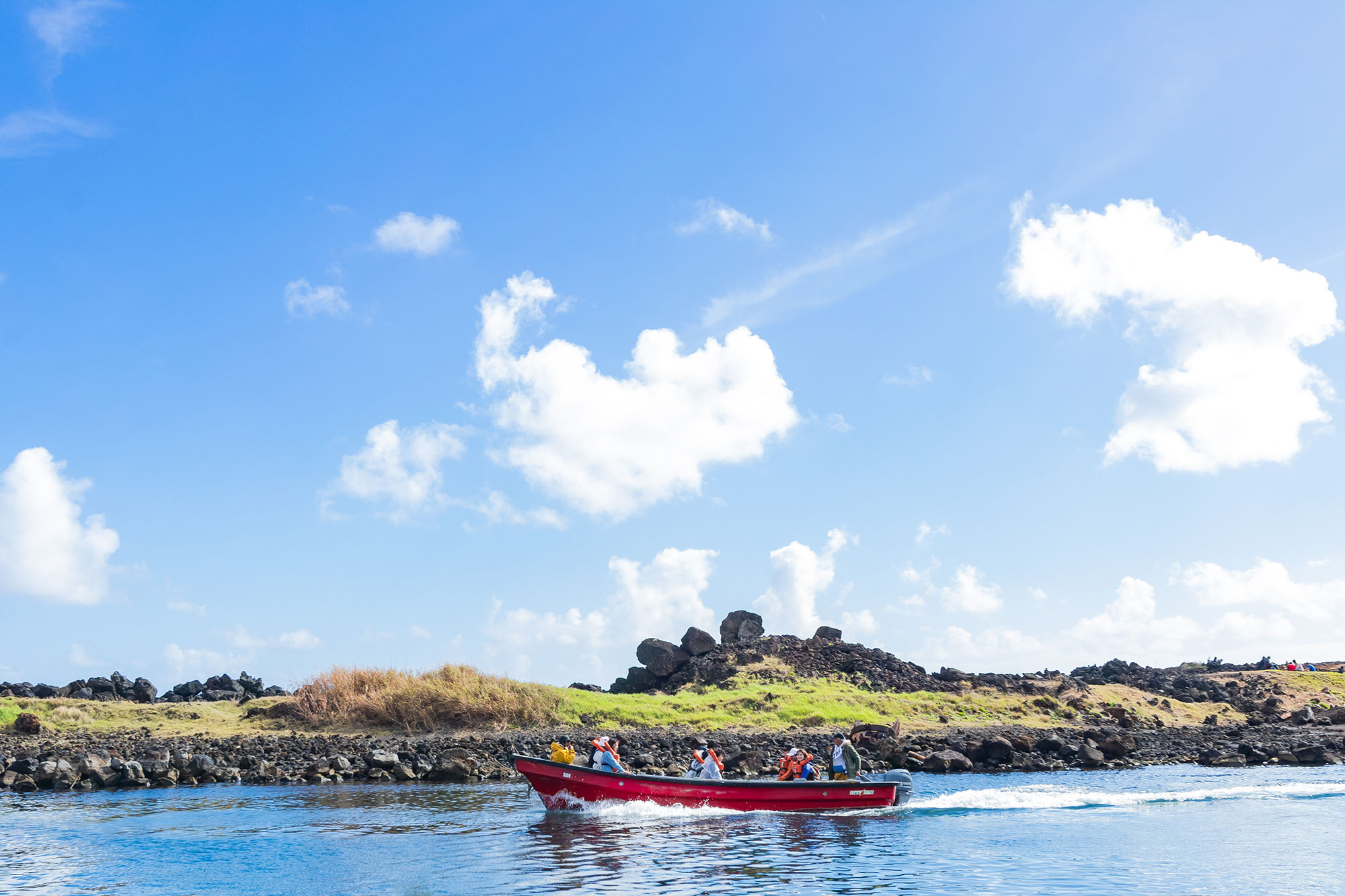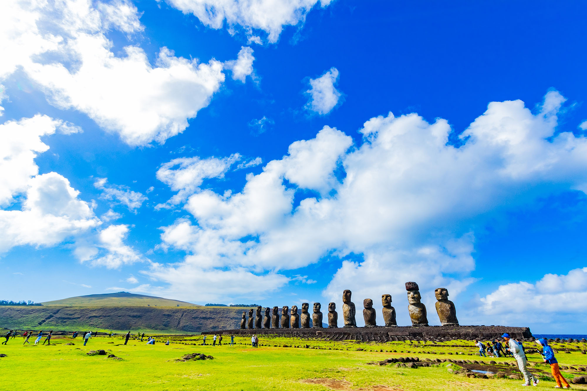 テンダーボートの乗って島へ。15体のモアイ像が並ぶアフ・トンガリキ。海を背に並ぶモアイは、表現できないほどの美しさです。