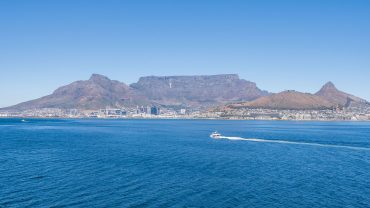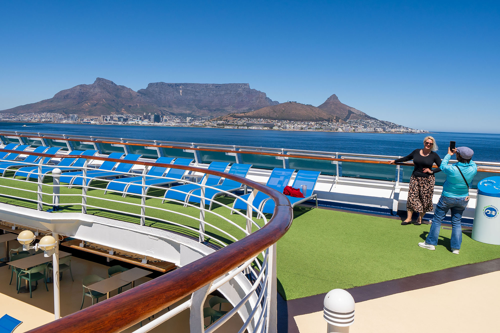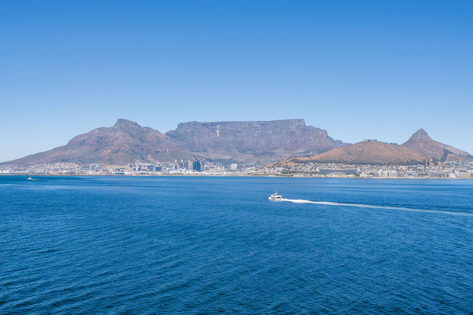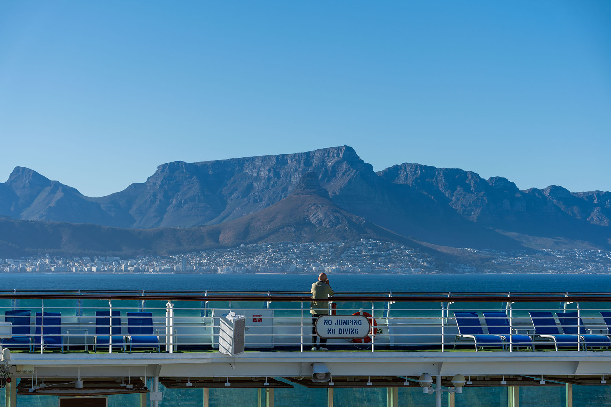 「テーブルマウンテン」が出迎える美しい入港シーンを楽しめるのは船旅ならでは。いよいよケープタウンへの旅の始まりです。