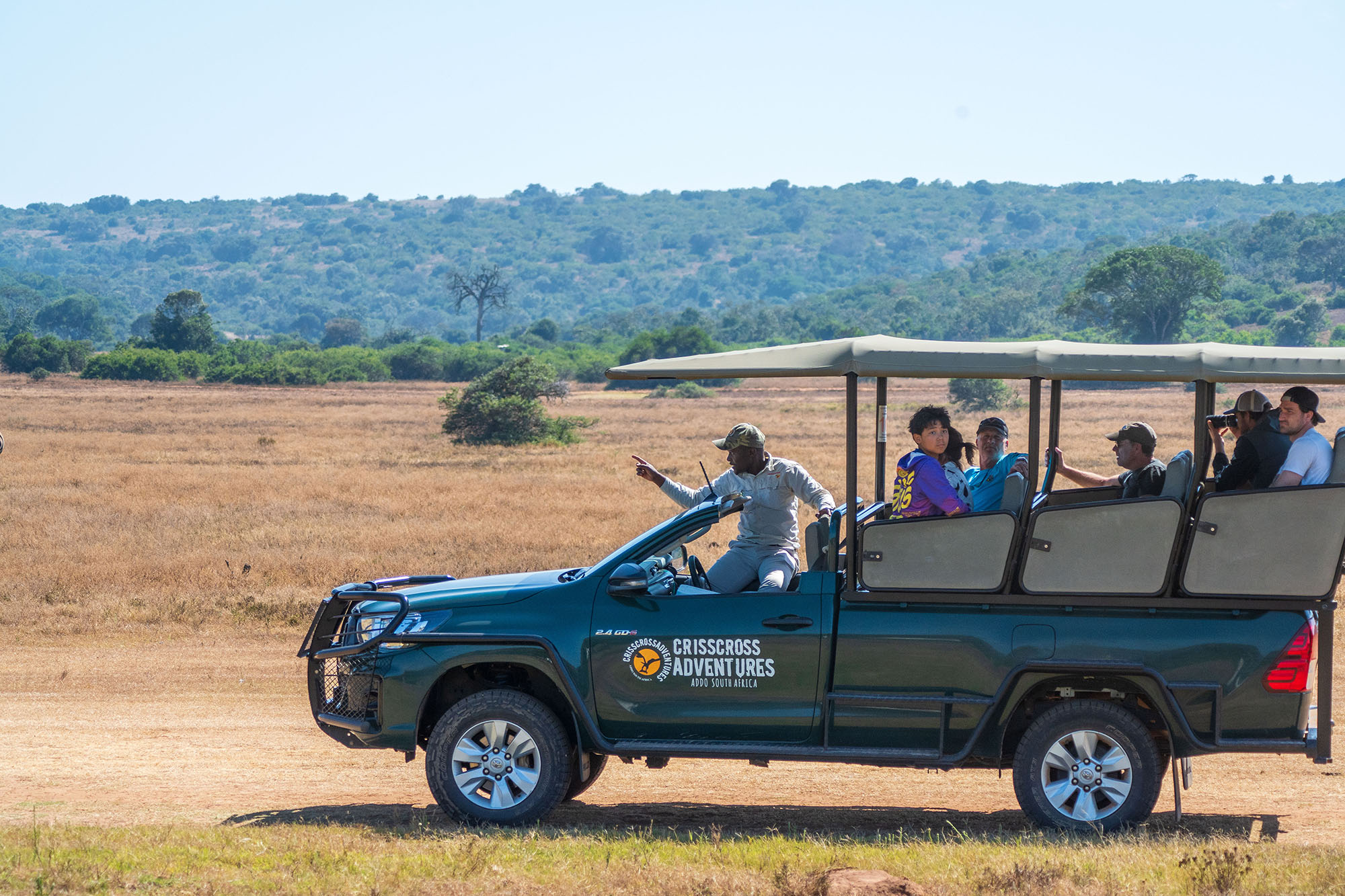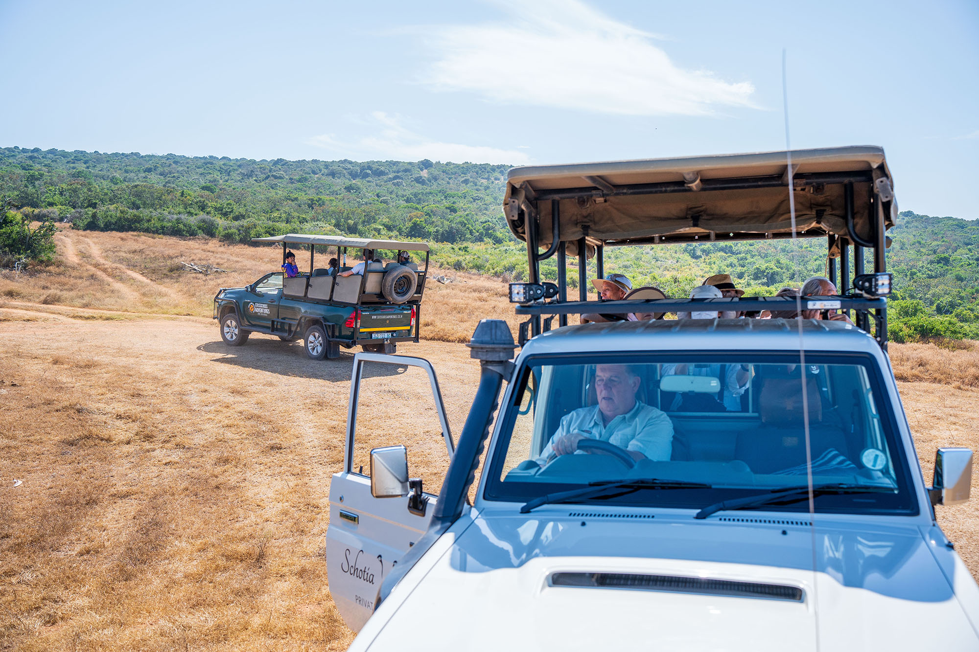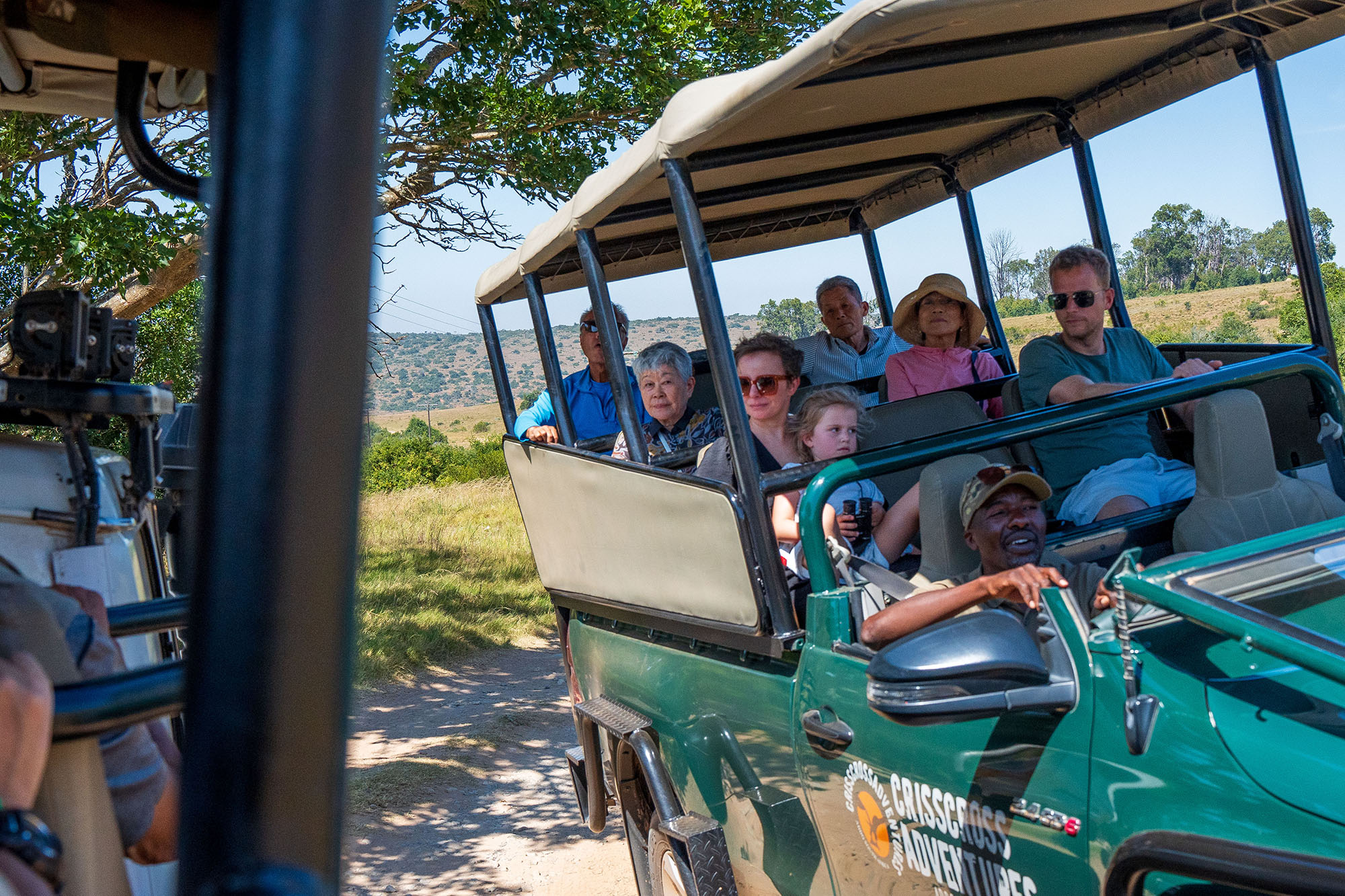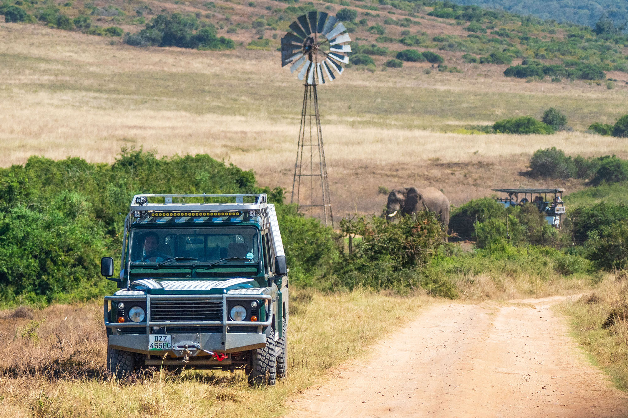四輪駆動車に乗ってアフリカの大地へ。動物保護区へのゲートを通り、動物が主役の世界へサファリガイドと共に向かいます。