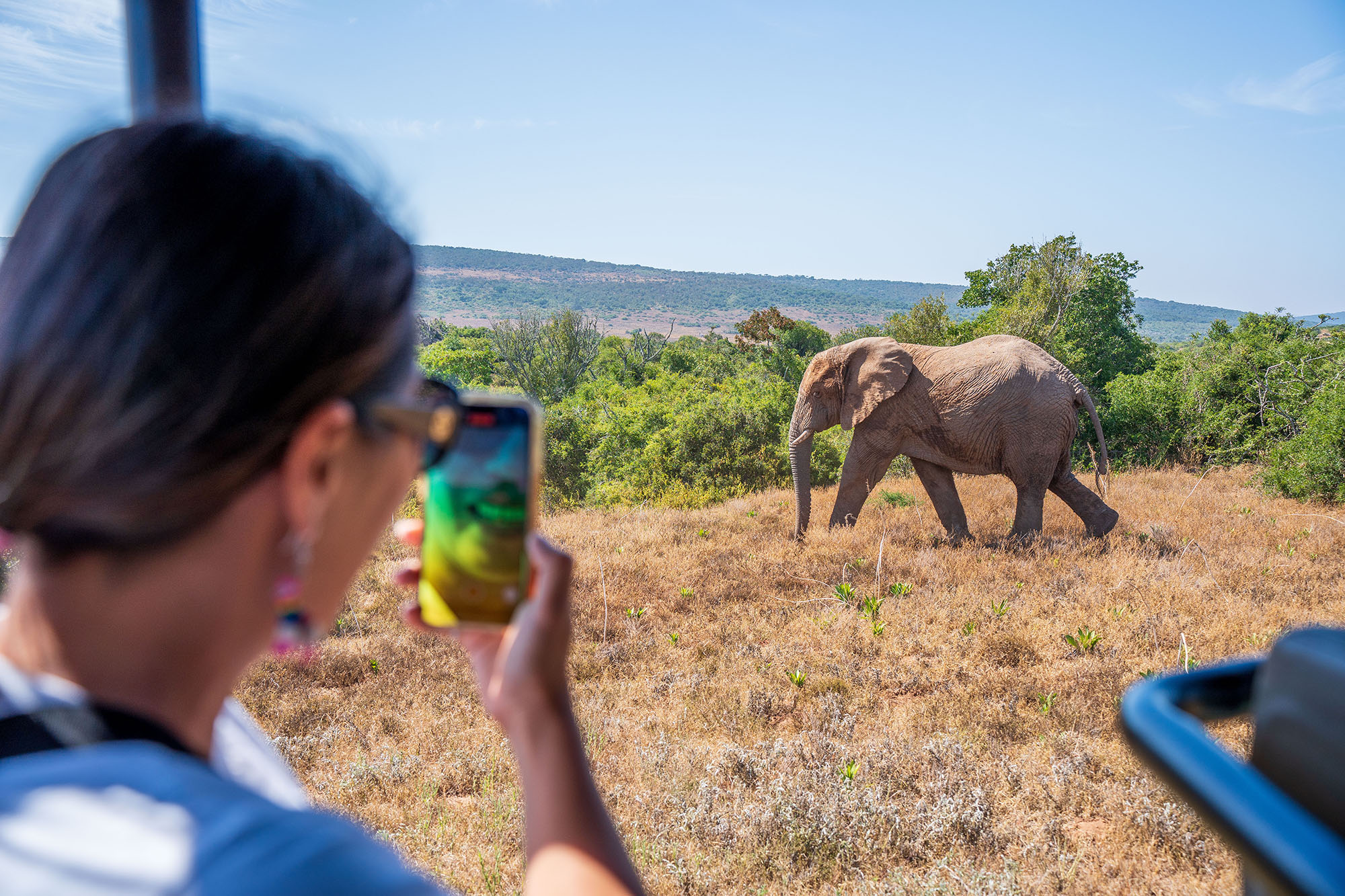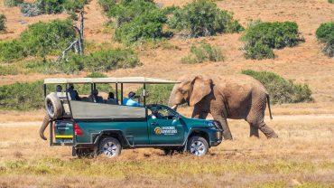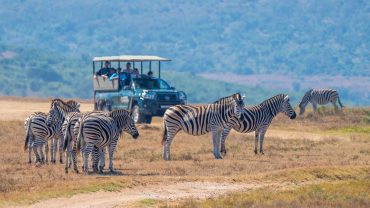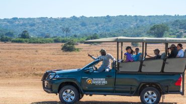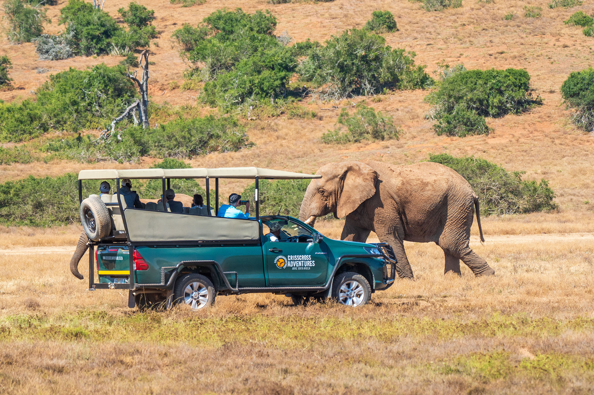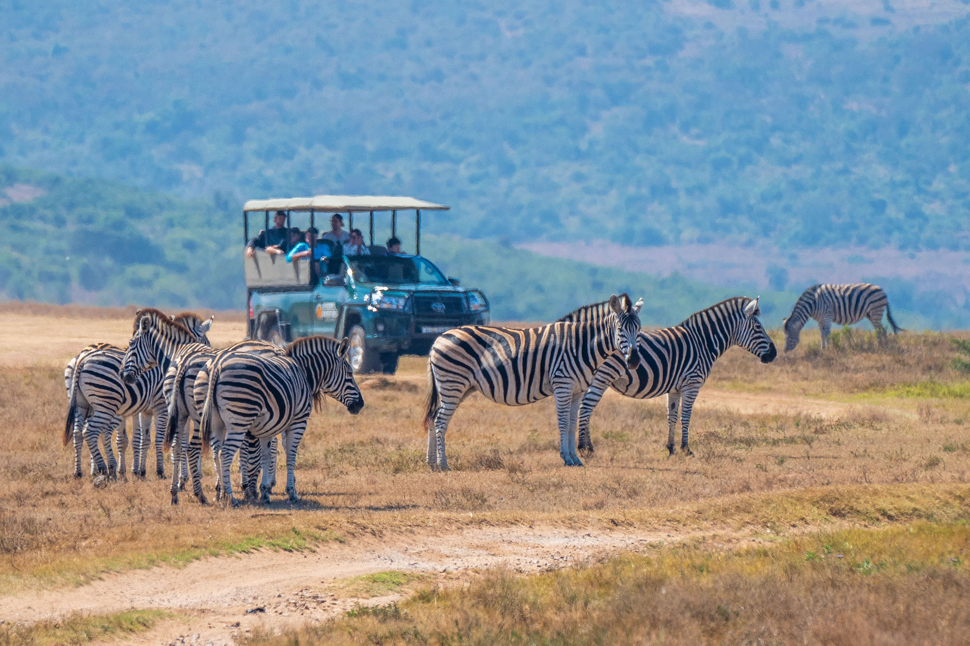 四輪駆動車に乗ってアフリカの大地へ。動物保護区へのゲートを通り、動物が主役の世界へサファリガイドと共に向かいます。