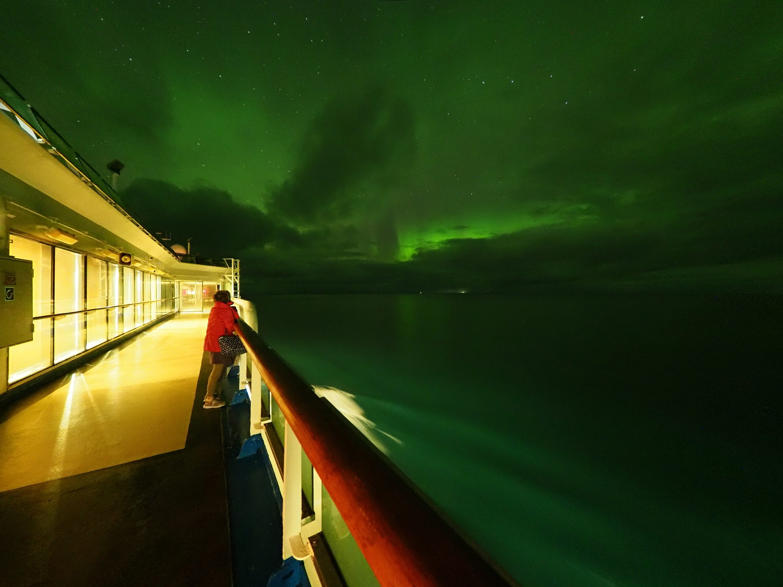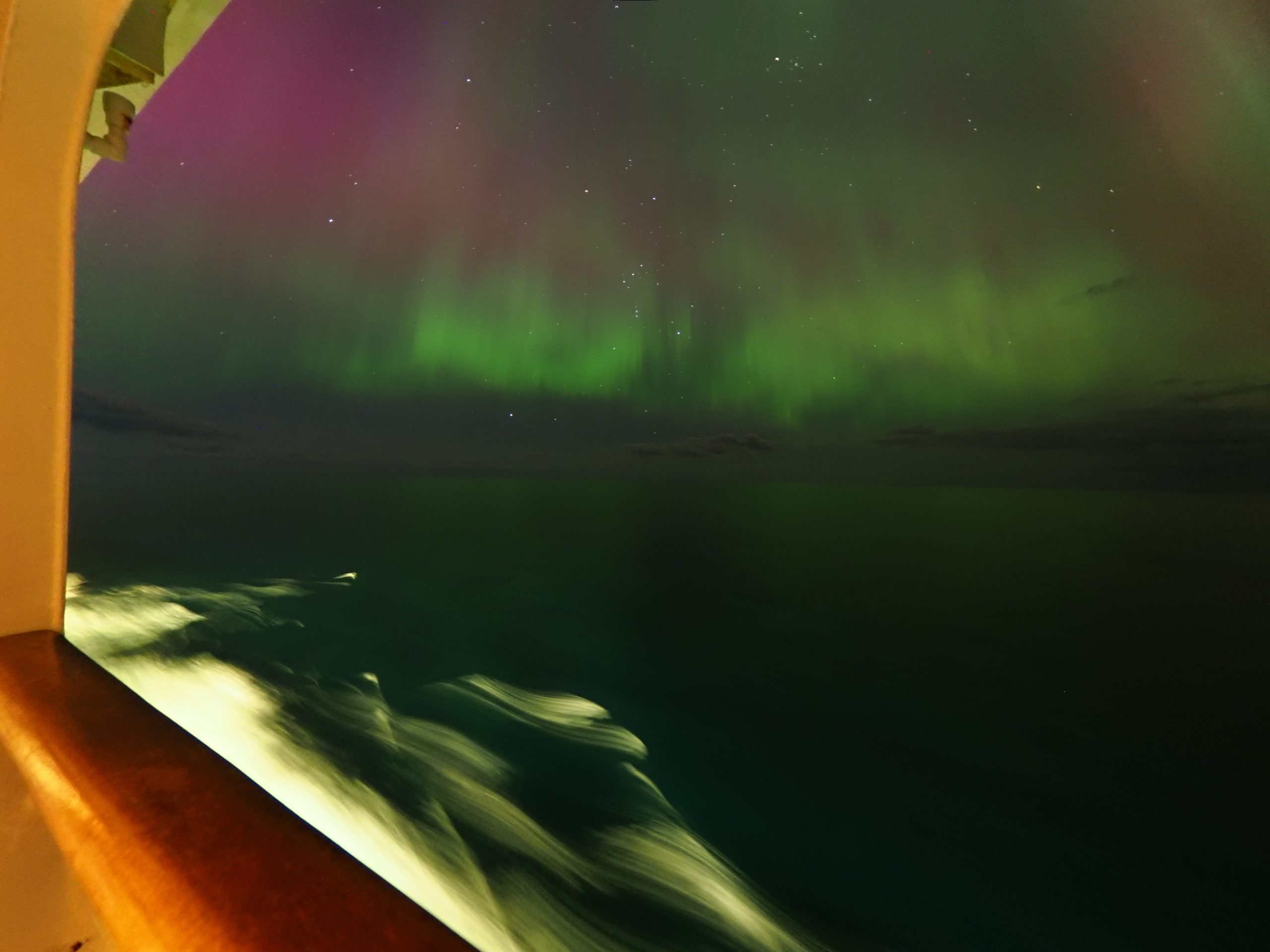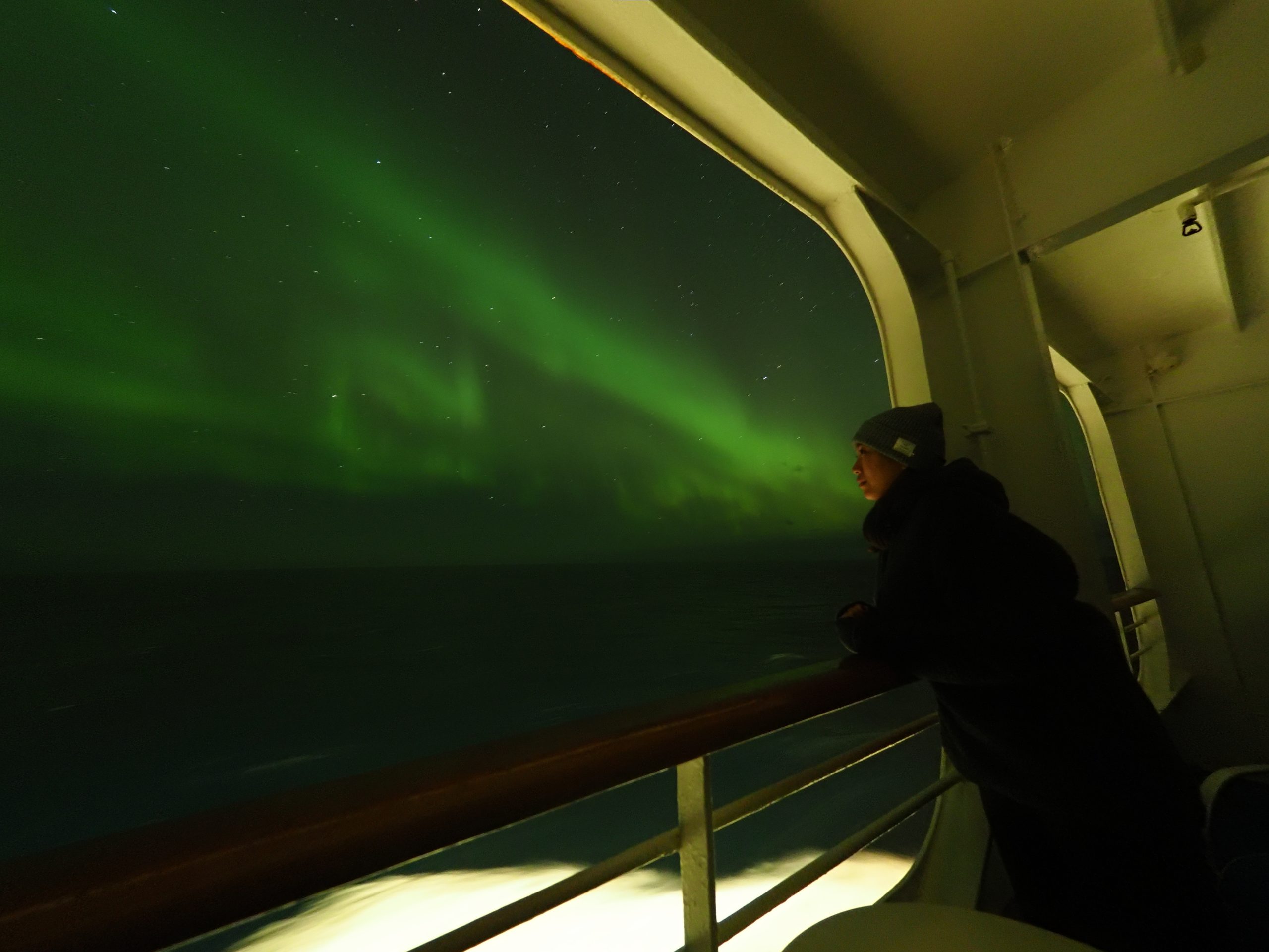 海上なら周囲は真っ暗で、街の明かりの影響を受けません。オーロラをさえぎる建物や山などもなく、360度見渡すことができます。