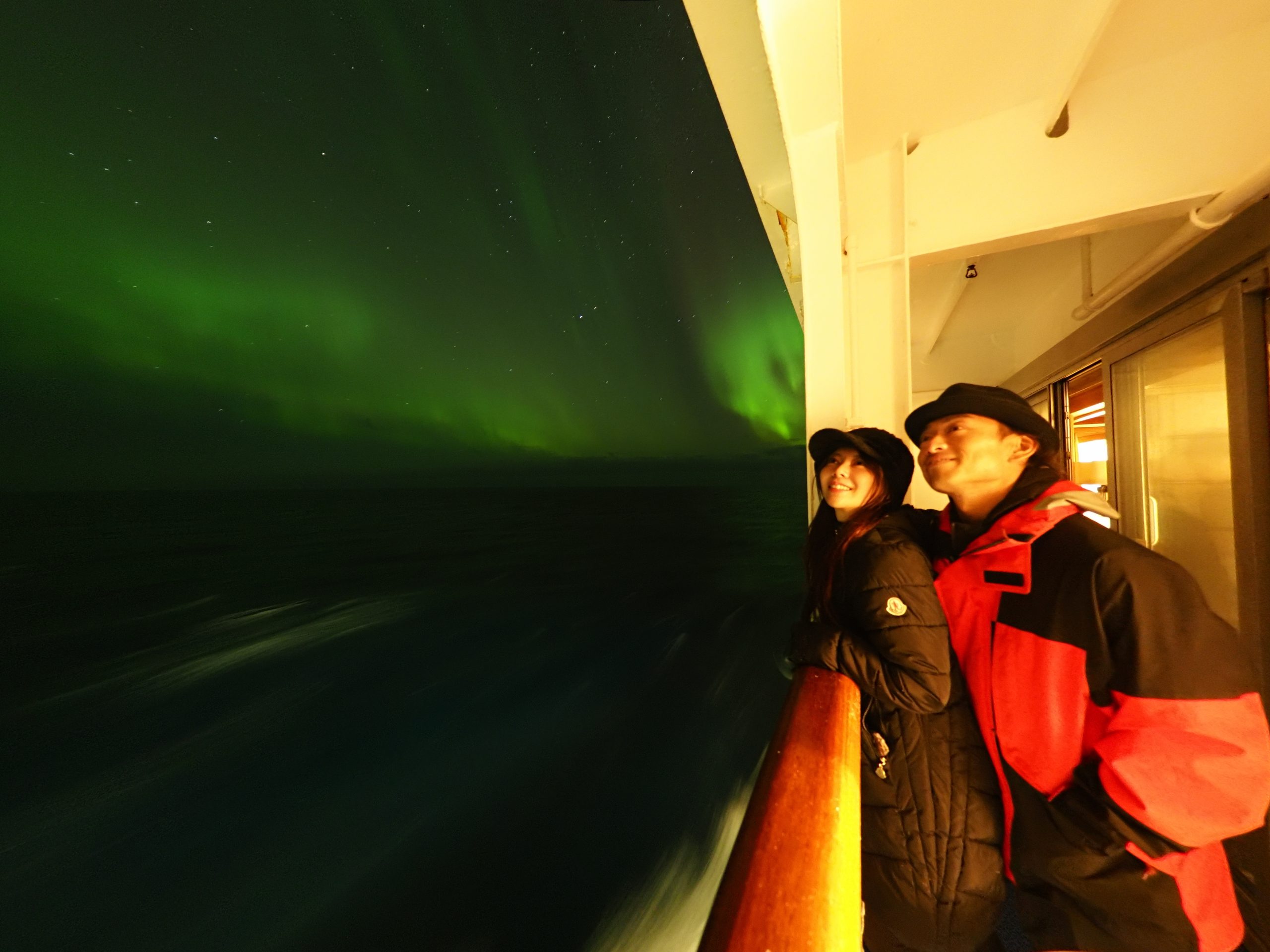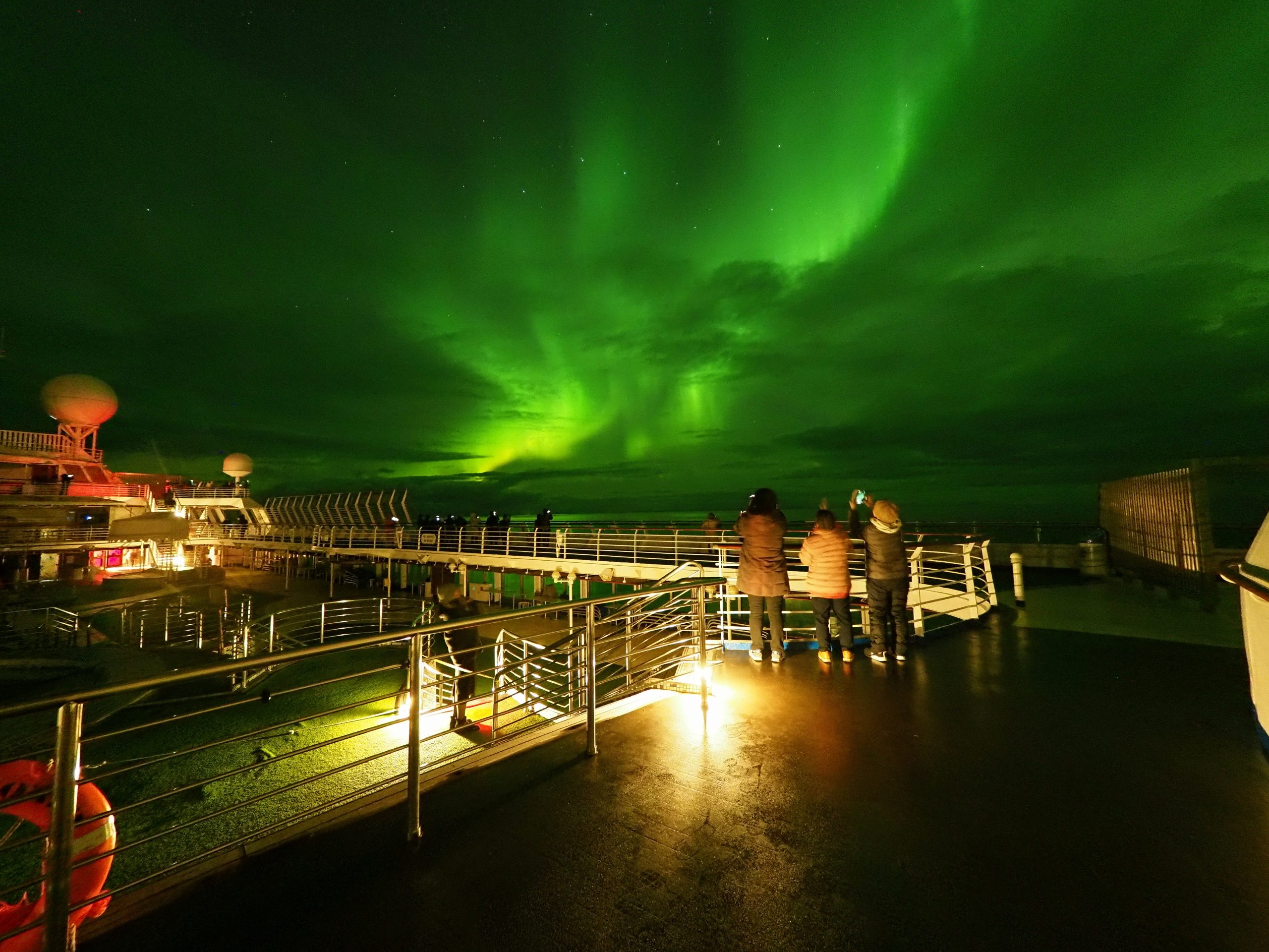 地上では1ヶ所でオーロラの出現を待つのが一般的ですが、クルーズ船では、晴れ間を目指してオーロラが発生しやすい場所まで移動できます。