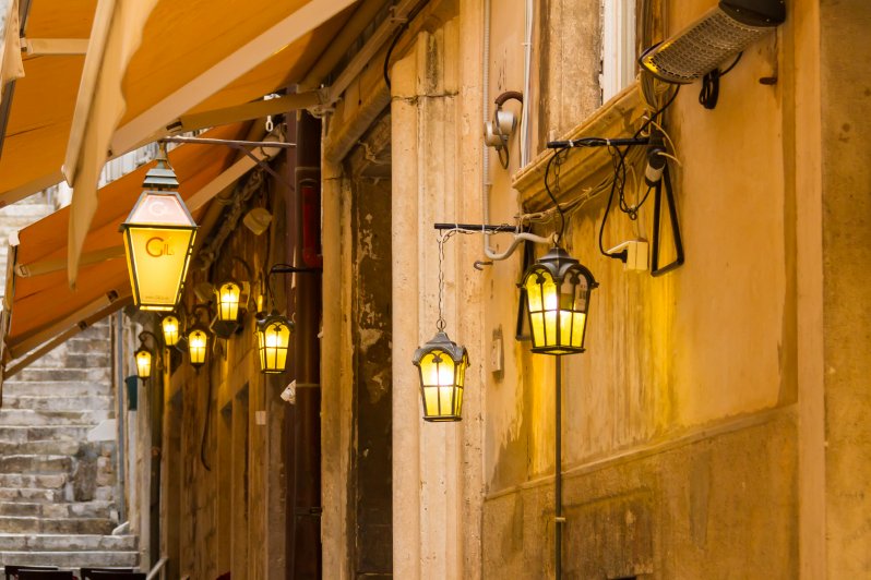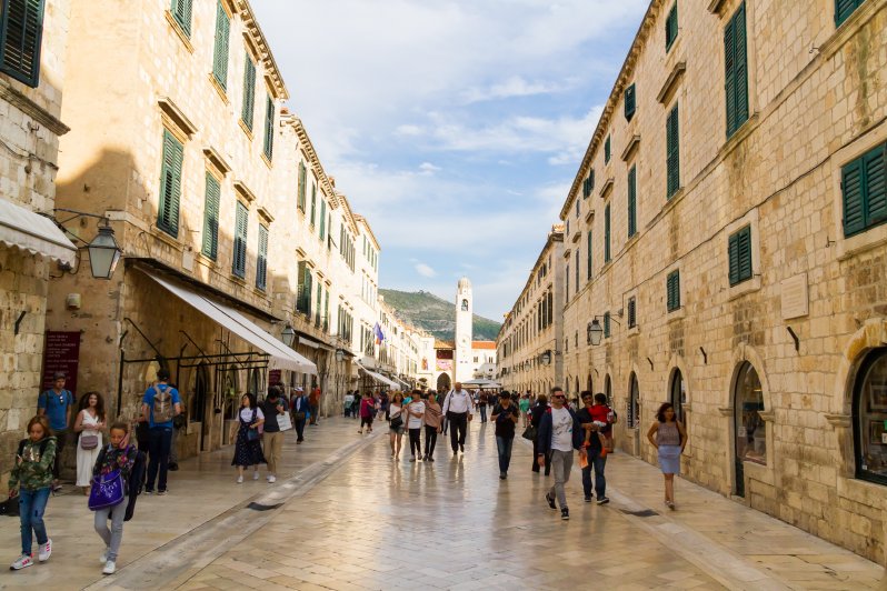 ドブロブニク旧市街の中心をはしるメインストリートであるプラツァ通り(ストラドゥン通りとも呼ばれる)は、大理石で舗装された美しい道です。カフェやレストラン、お土産店が立ち並び、多くの人々で賑わっています。