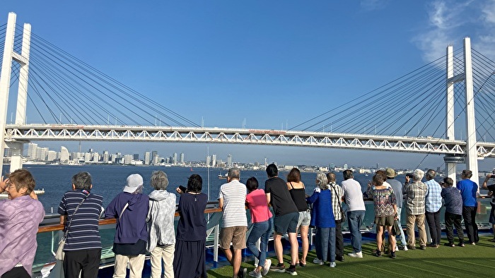 ショートクルーズ2日目の今日、船は本州と九州を隔てる関門海峡を通過しました。通過の際は船内放送がかかり、多くの人たちがデッキへと集まってきます。船が橋の下をゆっくり通過していくと、周囲からは歓声が上がりました。晴れ渡る夏空に見送られ、船は今クルーズ初めての寄港地・済州島を目指します。