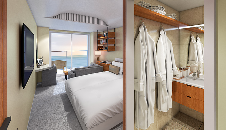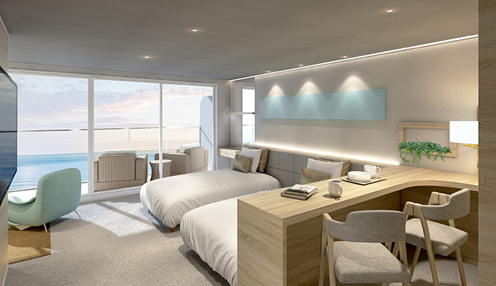 開放的なバルコニーで海の風を感じながら水平線を眺める──。優雅でスタイリッシュなスイートキャビンで心はずむ素敵なクルーズライフをお楽しみください。