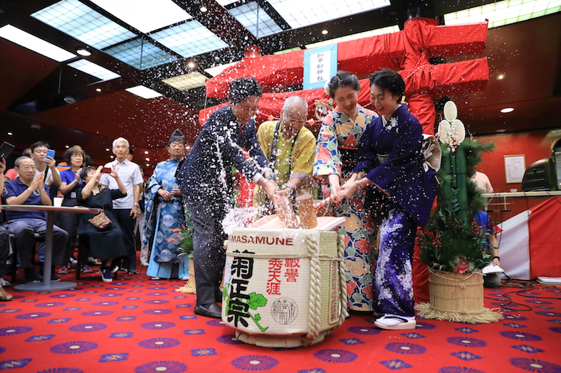 いよいよ2020年の幕開けです!!初日の出は残念ながら雨に降られてみることはできませんでしたが、うってかわり船内はお正月ムードにあふれます。8階中央フリースペースでは「新春!鏡開き」が開かれました。 お祝い事には欠かせない鏡開き。今年一年の健康と幸せを願い「せーのっ!」のかけ声でカンッ!! さまざまな地域から参加された方たちが乗る、ピースボートならではのお正月。その装いも和服にはじまり、韓服、モンゴル衣装、華服。まさに多文化共生とはこのことでしょう。みなさん楽しげに写真を撮り合います。そして旅に始まった2020年。新年あけましておめでとうございます!