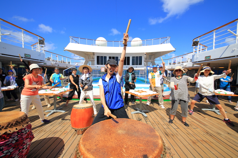 ドンドン!カッ!カッ!ドン!カッ!カッ!ーー軽快に、そして幾重にも響かせながら青空へ響き渡る太鼓の音色。船のデッキでは、人気の洋上カルチャースクール「太鼓教室」が開かれています。バチを握る講師は、なんとクルーズディレクターの恩田夏絵。その腕前は確かなもの。日本でも太鼓の講師を務めたことがある腕前なのです。基本のリズムを何度も何度も繰り返し、身体に染みこませていきます。きっと日本に着くころには相当の腕前になっているのではないでしょうか?船の上で太鼓の叩き方を覚えてきた!なんてちょっとかっこいいですよね。