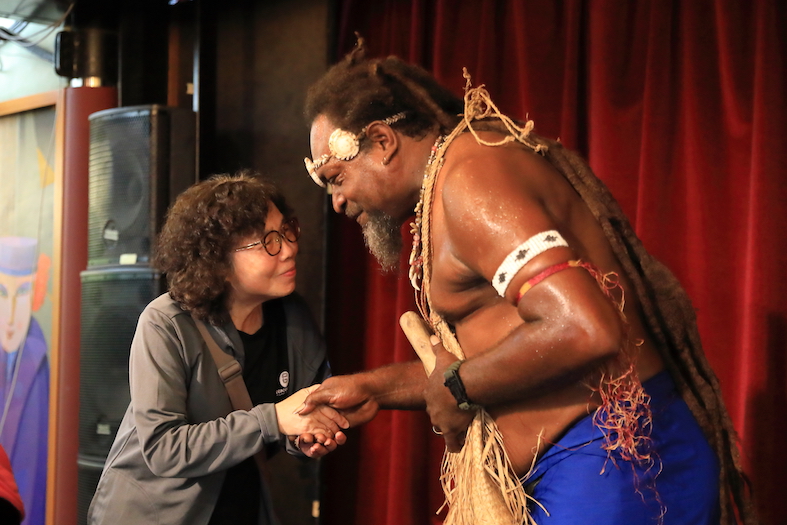 ソロモン諸島の民族的な歌や文化、神聖な楽曲の継承者として、島々をまわりながら年長者から伝統の知恵を受け継ぎ、その美しさや精神性を伝えている水先案内人ナティ・ドライアシさん(伝統文化継承者)。『メラネシア・アートフェスティバル』の国際イベントや映画『シバ・パシフィカ』の録音にもソロモン諸島を代表して参加されています。豊かな音やハーモニーを木でできた太鼓に合わせ7つの民族言語で歌う様は、「今までに聞いたことのない音楽」という言葉がふさわしいでしょう。ただただ純粋にナティさんの生声と打楽器のみでつくり出す旋律は、まさに南太平洋の世界観を感じさせてくれます。