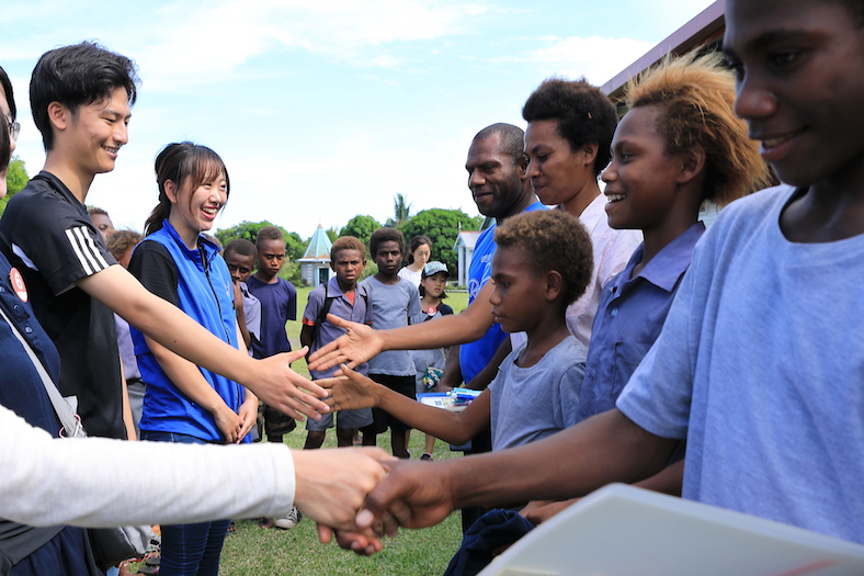 オーシャンドリーム号は最後の寄港地、パプアニューギニアのラバウルに到着。今日は「ラバウルの学校訪問&交流会」ツアーに参加します!参加者は、訪問するセイント・マーティン学校に届ける支援物資(ピースボート が1984年から続けている「UPA国際協力プロジェクト」)を手に船からおりてきます。学校では120人の生徒たちや地元の人たちから歌や民族ダンスが披露され、こちらからも折り紙やあやとり、大縄跳び、「だるまさんがころんだ」をして会場は大盛り上がり。ただの観光だけでなく、現地の方々との交流や文化体験ができて、皆さん楽しい思い出がつくれたのではないでしょうか。