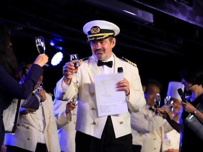 船内生活も早いもので残りわずか。船長主催のフェアウェルセレモニーでは「私のクルーズ人生の中でも本当に記憶に残る良い乗船者にめぐまれました」と船長のなんとも嬉しい言葉も。オフィサーを含め多くのクルー(乗組員)たちが、私たちの船内生活を支え続けてくれました。 お互いに感謝の気持ちをこめて「乾杯!」 。 その後は専属バンドの演奏とともにパーティーは続きます。 また本日は特別なフェアウェルディナーです。 途中、全クルーたちによるサプライズで大合唱が始まります!! 船内では「ありがとう」「これからもよろしくね」「また会いましょう」そんな言葉が交わされていました。