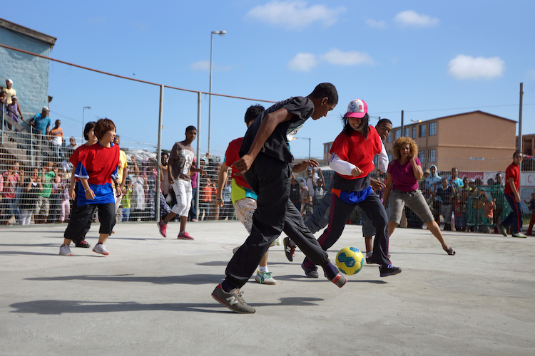 地球一周の船旅は南アフリカ、ケープタウンに入港。今回は、ケープタウンの旧黒人居住区・タウンシップの訪問プログラムに参加しました。訪れたのは、ケープタウン市内で最も規模の大きなタウンシップ。人口約10万人、失業率は50%を越え、貧困に伴う犯罪や暴力、またHIV/AIDSの感染拡大など多くの問題を抱えています。現地に到着後、始まったのはサッカー交流。お互いに男女混合チームを作ってボールを追います。言葉が通じなくても、文化が違っても、一緒にボールを追いかけるだけで仲良くなれる。それがサッカーのいいところ!素晴らしい1日となりました。