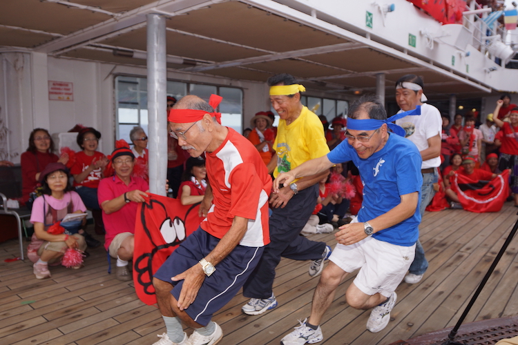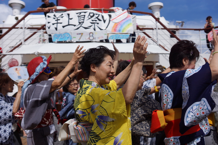 南半球をゆくオーシャンドリーム号。デッキへ出ると、真夏の大きな太陽が輝いています。そんな夏真っ盛りの中、洋上夏祭りが開催されました!浴衣コンテストやかき氷食べ競争、南中ソーランの披露など、デッキではさまざまなイベントが行われました。そして夏祭りのラストを飾るのは、やっぱり盆踊り。東京音頭や河内音頭など、お馴染みの音楽が流れれば自然とカラダが動き出し、デッキには大きな輪が。日本にいたら真冬の1月下旬、太平洋のド真ん中、”真夏”の太陽の下で行った夏祭りは旅の大切な思い出に——。