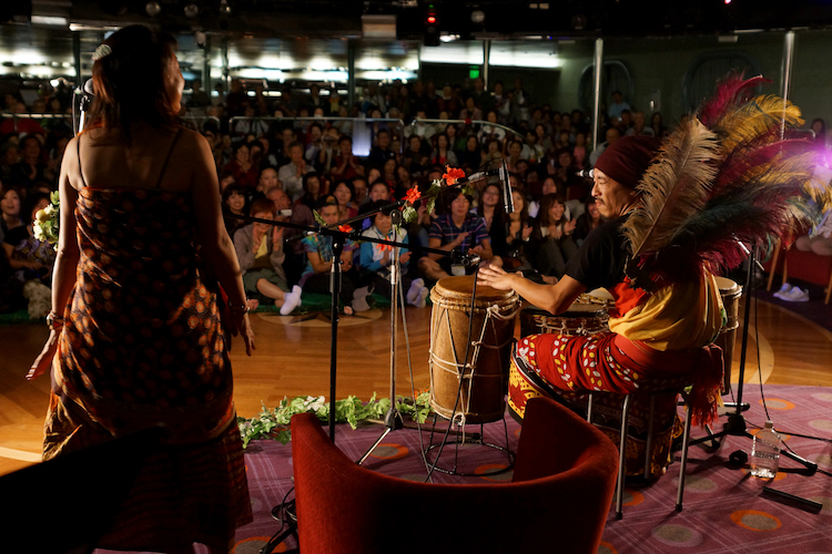 今クルーズの見どころに、アフリカの寄港地を挙げる方も多いはず。そんな期待に応えるように、アフリカンライブが行われました!ステージに上がったのは、25年間ケニアで暮らす水先案内人・早川千晶さんと、パーカッショニストの大西匡哉さんです。早川さんの優しい語りからライブはスタート。会場に柔らかな空気が満ちたところに、早川さんのパワフルな歌声と大西さんの刻むパーカッションのリズムが響きます。参加者から大歓声と拍手がわき起こり、会場の盛り上がりは一気に最高潮へ!今から、アフリカ寄港が待ち遠しい、そんな一夜となりました。