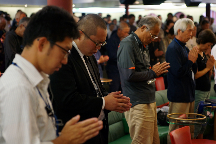 東日本大震災から2年を迎える今日、洋上でもその犠牲者を悼む追悼式を行いました。日本時間3月11日14時46分(船時間3月10日19時46分)、黙祷を捧げた後、参加者有志による合唱。『しあわせを運べるように』、『花は咲く』、フォーレの『レクイエム』の3曲を歌いました。クルーズ参加者で、住職の伊藤明麿さんの読経に、手を合わせ、犠牲になった方々の冥福と被災された方々・地域の復興を祈ります。最後に全員で『ふるさと』を合唱。東日本大震災で被災された地域や復興について考えると共に、それぞれの思う”ふるさと”に思いを馳せる時間となりました。