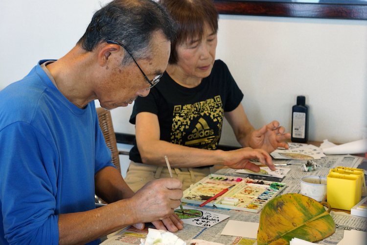 地球一周の船旅の人気プログラム、洋上カルチャースクール。こちらは絵手紙教室です。他のプログラム同様、この絵手紙も大人気。レッスンごとに何を描くかテーマを決め、モデルを準備。先生の指導を受けながら描いていきます。テーマには、フルーツやきれいな葉っぱなど、色鮮やかなものが人気のよう。レッスンはまだ始まったばかり。皆さん、先生のお手本を真似ることから始めていますが、「個性や独創性のある、自分らしい作品をめざしましょう」という言葉に、構図を変えてみたり、差し色に挑戦したりと、一工夫を加えます。地球一周を通してどんな絵はがきが生まれるのか、とっても楽しみです。