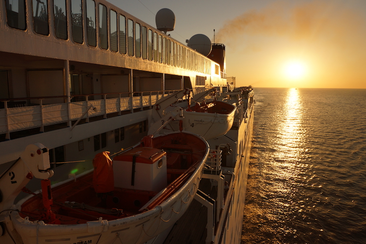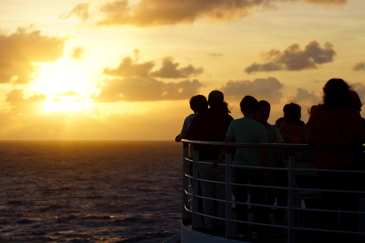 360度を大海原に囲まれた洋上。水平線から昇り、また水平線へと沈む朝日や夕日も旅の醍醐味のひとつです。この朝日、夕日を堪能することを旅の目的とされている方も少なくありません。そこで今日はこの素晴らしい景色を少しだけご紹介。今日は見事な夕日を望むことができました。この夕日を毎日写真に収めることを旅の日課としている、という方も少なくありません。「地球一周が終わる頃には、世界の夕日の写真集が完成するんですよ」この景色だけでも、地球一周する価値、ありますよ!