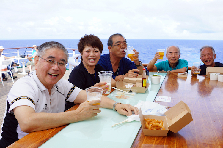 出航から2週間。たくさんの船内企画に寄港地プログラムに、目まぐるしく充実の日々が続いてきたこの旅。この辺でちょっと一息、と今日は船内企画をすべて「お休み」にするリフレッシュデーです。皆さん、デッキでのんびり海を眺めたり、ソファで本を読んだり、日本の家族に手紙を書いたり……と思い思いに過ごします。午後、デッキでは本日限定のビアガーデンが開催!おつまみのソーセージ焼きも登場し、いい香りです。ビールとおつまみを囲んで談笑する皆さんをパシャリ。講座やイベントに参加することも、企画を作ることも、そして何もしない時間を楽しむことも、すべて船旅の醍醐味なんですよね!