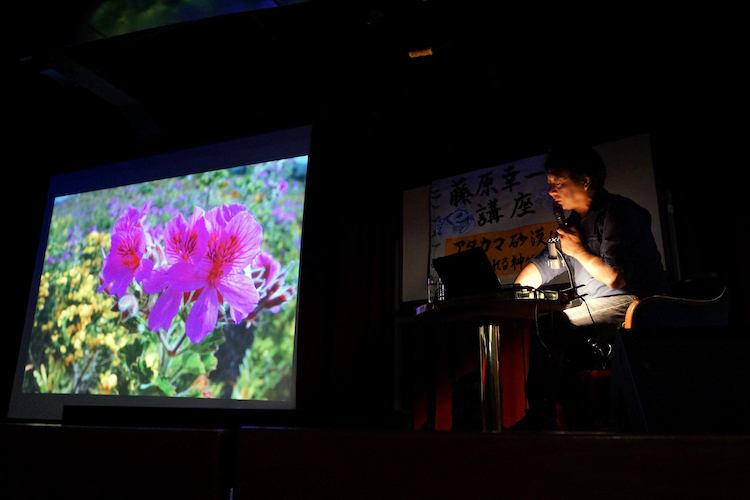 壮大な自然環境の中に生きる動植物の姿を捉えるフォトジャーナリストの藤原幸一さんが船内講座に登場!!今日のテーマは、「世界三大砂漠」のひとつ、南米チリのアタカマ沙漠。「地球上で最も乾いた地域と言われる場所ですが、年に1度不思議な自然現象が起こるんです」そんな言葉と共に、スクリーンには美しいピンクの花が!アタカマ沙漠が春を迎える9〜10月頃、沙漠に突如草原が現れ、色とりどりの花が一斉に咲き誇るのです。花の次期を終えると、草原は姿を消し、何事も無かったかのように沙漠へと戻ります。藤原さんが語る、壮大な大自然の営み、まだ見ぬ地球の姿。藤原さんの次回講座にも注目です。