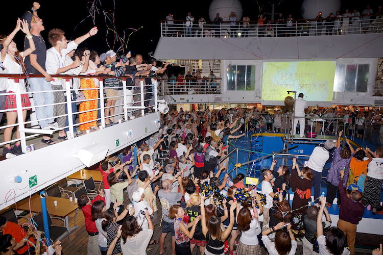 紅白歌合戦の余韻さめやらぬまま、会場をデッキへと移し、年越しのカウントダウンパーティーが始まります。いよいよ2012年も残り僅か。10,9,8……と声を合わせ、「0(ゼロ)」の瞬間クラッカーが鳴り響き、スクリーンには「Happy New Year!」の文字、そして大歓声があがります。オーシャンドリーム号は、夜空に向かって力強い汽笛で新年のご挨拶。さぁ、2013年のスタートです!会場はそのままニューイヤーパーティーへ。DJブースから流れる音楽に身を任せ、2013年最初のダンスタイムが始まりました。あちこちから何度もあがる乾杯の声。大盛り上がりの一夜となりました。