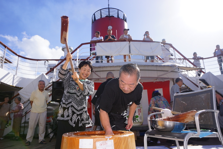 お正月企画一色の船内、デッキでは餅つきが始まりました!蒸し上がった餅米を臼に入れたら餅つきスタート。気合い十分のねじりハチマキ姿の男性は……水先案内人の大沢則夫さんではないですか!見事な手さばきで餅を返す大沢さん、大活躍です。若者たちだって負けてはいられません。杵を持ち上げて、よいしょっと……えいっ。「足が反対だよ!それからもっと腰をいれないと!」ベテランさんらの熱烈指導を受けながらがんばりますが、明らかにスピードが違う。若者たち、がんばれ〜(笑) つきたてのお餅、皆さん本当に嬉しそう。お餅って、それもつきたては本当に美味しいですよね!