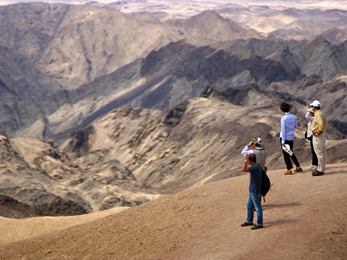 ウォルビスベイの郊外、「デューンセブン」と名付けられた砂丘もナミブ砂漠を代表するスポットのひとつ。赤い砂を踏みしめながら斜面を登った先には、見渡す限り砂漠の広がる大パノラマが待ち受けています。頂上からの景観だけではなく、走ったりお尻で滑ったりしながら、一気に砂丘を駆け下りるアクティブな体験も、デューンセブンの楽しみ方。転がり落ちても砂が衝撃を吸収してくれるため、怪我をすることはまずありません。さながら天然のクッション。全身でナミブ砂漠を感じる、爽快な体験です。