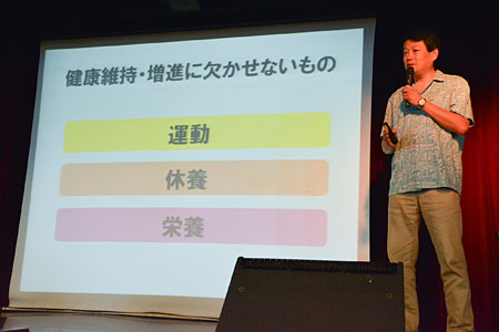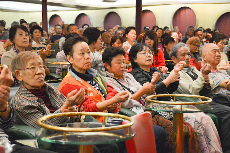 健康アドバイザーで、本船のマッサージルーム「アママ」でもお馴染みの武医道家・大沢則夫さんによる講座は、随所で大沢さん直伝のストレッチを交えながら進行します。「身体の力を抜いて腕をブラブラ〜っと……少し硬い人がいますよ。見ているこっちまで硬くなっちゃいますよ(笑)」こんな風に力を抜いて腕を動かすことで、痛みや凝りを見つけるそう。風邪は万病の元、なんて言葉がありますが、何かの例えではなく事実なんですね。「次の寄港地コタキナバルでも、ブラブラしながら歩きましょう!」思わず”へぇ〜”と唸ってしまうような発見いっぱいながら、笑顔の絶えない楽しい講座となりました。
