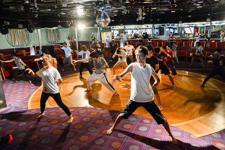 参加者自身が趣味や特技を活かし、主催者や講師となって企画・運営する「自主企画」。ピースボートの洋上ならではのものとして、人気を集めています。こちらはその自主企画のひとつ「よさこいソーラン節」。参加者数は「毎回、30〜50人くらい」というから、なかなかの人気ぶり。「ドッコイショー、ドッコイショー!」「ソーラン、ソーラン!!」今日も元気な声がラウンジに響きます。当面の「目標」は、マダガスカル寄港の翌日に開催が予定されている夏祭りでお披露目すること。皆さん、練習にも熱が入ります。当日のアツいパフォーマンスに期待です!!