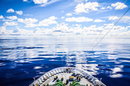 太平洋をゆくオーシャンドリーム号。今日は、ひときわ波も穏やか……とデッキへ出てみると、素晴らしい光景!!!!海が、鏡のように雲と空を映します。青い海が青空を映す——なんて美しいんでしょう。これは波も風もない「ベタ凪」と呼ばれる時に見られる景色。約100日間の地球一周でも、数えるほどしか出会えないものです。夕刻、水平線の向こうに陽が沈みます。海の青、空の青に金色の陽光が混ざり、美しい色彩を描き出します。本船が向かうのは、周囲数千キロにわたって島影を見ない「絶海の孤島」。月を頼りに、私たちもイースター島を目指します。