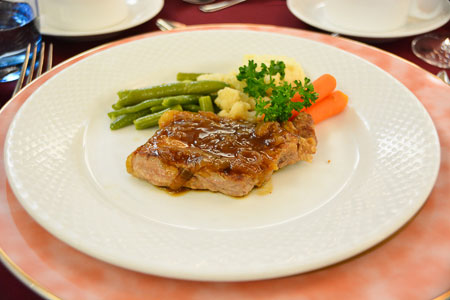 ウェルカムパーティーを終えレストランへ。パーティーに続いて、ディナーもちょっぴりオシャレな装いで楽しみます。写真いいですか?と声をかけると、大きなピースサインで応じてくれました!メインはローストビーフ。お味をたずねると、「美味しいで〜す!」と皆さんニッコリ。ドレス姿がステキです!ちょっぴりオシャレなウェルカムパーティー&ディナーを終え、明日からいよいよ、船内生活も本格始動です。こうご期待!!