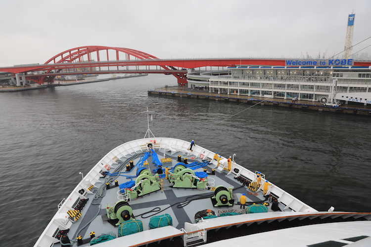 まもなく船は、今クルーズの帰着地・神戸港へ。次第に近付く神戸の街並みに、「帰ってきちゃったねぇ……」なんて声もあがります。懐かしくて、嬉しくて、ちょっぴり寂しい——何とも複雑な気分。まもなく着岸。長かったような短かったような——105日間の船旅が終わります。共に旅したオーシャンドリーム号、今となっては家族のような存在になった旅仲間ともお別れです。でも、旅の経験や出会いが失われることはありません。ここからまた、新しい毎日が始まります。