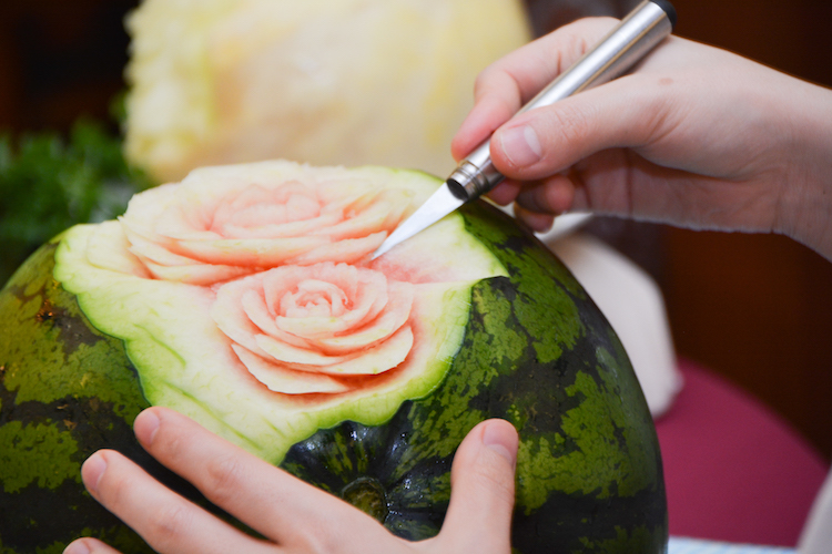 シンガポールを出港し、インド洋をゆくオーシャンドリーム号。レストランでは、シンガポールで仕入れた果物を振る舞うフルーツパーティーが始まりました!スターフルーツにパイナップル、ドラゴンフルーツ、パパイヤ……注目はフルーツの王様、ドリアン!お皿を持ってビュッフェ台へ。クルーの皆さんが色鮮やかなフルーツを盛りつけてくれます。お味だけでなく、目にも楽しいのがフルーツパーティー。シェフによるカービングも見どころです。何でもないスイカがみるみるうちに、美しく花開きます。スゴ〜い!!!美味しくて、美しくて、楽しい、素晴らしいフルーツパーティーとなりました!
