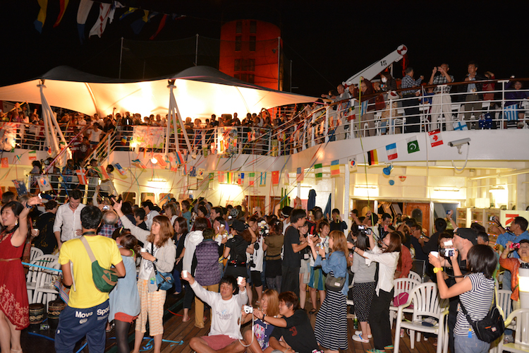 まもなく2015年。デッキではカウントダウンパーティーが始まります!!司会は、クルーズ・ディレクターを務めるピースボートの田中洋介と、CC(コミュニケーション・コーディネーター=通訳スタッフ)をまとめる寺地亜美。デッキにはたくさんの参加者が詰めかけました。いよいよ年越しの瞬間、カウントダウンが始まります。……5、4、3、2、1……HAPPY NEW YEAR!!!!隣の人と、その隣の人と、そのまた隣の人と……乾杯! ハグ!! 今年もヨロシクお願いします!!
