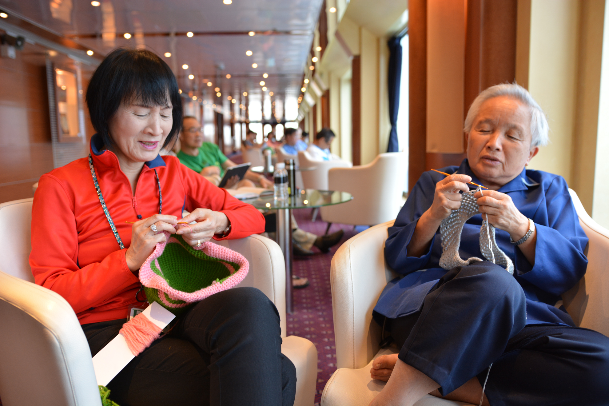 洋上生活の醍醐味と言えば——美しい朝日、夕日をあげる方も多いのではないでしょうか。水平線から昇る朝日を見ようと、今朝もデッキにはたくさんの参加者が。毎日の朝日・夕日を写真に収めることを、地球一周の日課としている方も少なくないよう。日中の船内。企画や講座に忙しく参加する合間に、窓辺のプロムナードで編み物を楽しむ方も。こんな風に、のんびり自分のペースで編み物に取り組めるのも地球一周ならでは、ですよね。何を編んでいるんでしょう?と声をかけると「まだ途中だけどね(笑)」とちょっと実演。お帽子とサマーセーターですね。カワイイ!!完成が楽しみです。
