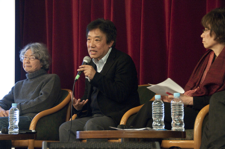 鹿児島大学で平和学を教える木村朗さんと、ルポライターの鎌田慧さんから、沖縄の基地問題の背景と現状について解説していただきました。鎌田さんは、「沖縄の人口は日本の0.7%。そこに基地の7割以上が集中している。世界では1%の富裕層のために99%が犠牲になっていると言わるが、沖縄の場合は逆で、99%の本土の安全のために1%以下の沖縄に負担が押し付けられている」と指摘。木村さんは、「事故の多い米軍の新型機オスプレイ配備や、相次ぐ米兵による事件を繰り返されてきた沖縄の怒りは限界に達している」、「大和(日本)とアメリカによる二重の植民地状況に置かれているのが問題」と語りました。
