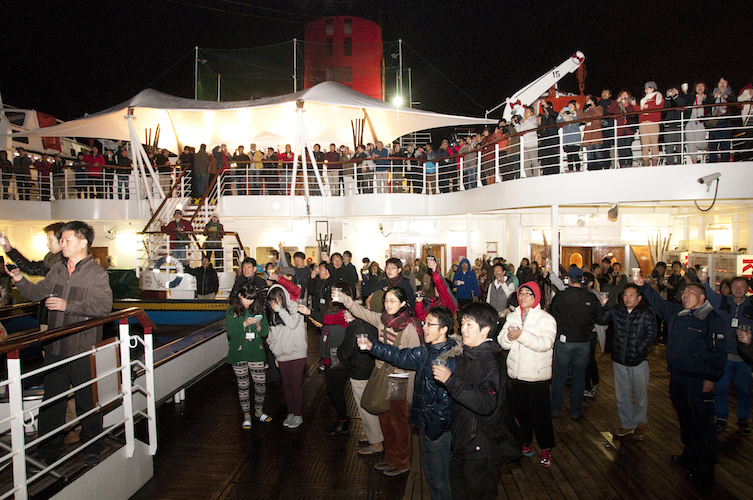 昨日の「プレ出航」に続いて、今日は出航本番!!韓国からの参加者約450名が乗船し、日韓総勢約900名の日韓クルーズが始まりました。デッキでは盛大な出航式を開催し、参加者一同、マッコリで乾杯!ここから船は南下し、目指すは沖縄・那覇です。洋上で、寄港地でどんな日々が紡がれるのか、こうご期待!
