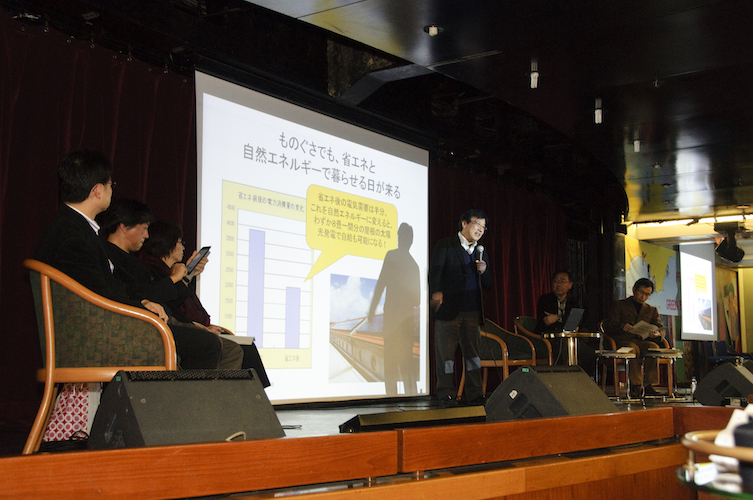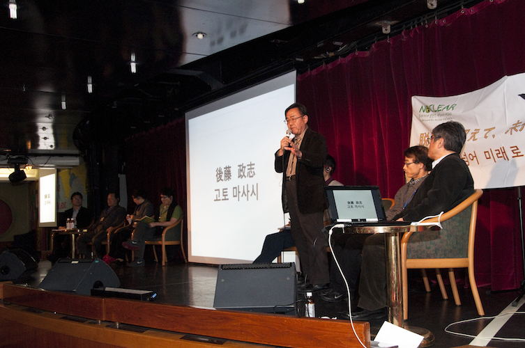 東アジアのつながりを活かして持続可能な社会をどのように実現していくのか、日韓のゲストが意見を交換する企画が行われました。エネルギー政策の専門家でソウル大学のユン・スンジン教授は、原発立地を訪ねたこの船旅で感じたこととして、「原発は核を分裂させるばかりでなく、地域を分裂させるものだと思いました。私たちはエネルギーの消費者としてだけでなく、生産者の視点からも脱原発を提案していく必要がある」と語りました。元原発設計者の後藤政志さんは、「原発推進の立場からではなく、市民の側に立って原子炉の安全性や技術的な話をできる専門家同士がつながる必要がある」と訴えました。