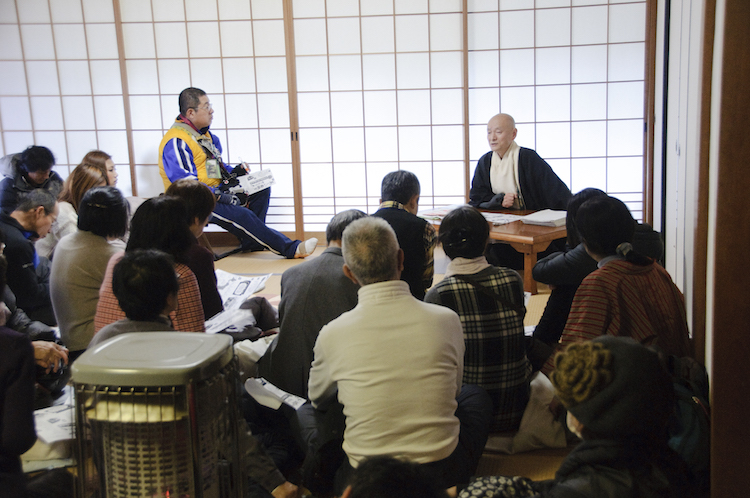中国や朝鮮半島と日本とをつなぐ港町として栄えてきた小浜の町を、地元の方にご案内いただき、地域興しに取り組む人々と出会うプログラムに参加。地域を大切に思う人々にとって、「原発立地地域」と呼ばれる町に暮らすのは、どのようなことなのか——多くを考えるプログラムとなりました。昼食は地元の民宿で、若狭の海の幸をふんだんに使ったお料理をいただきます。鯛を揚げた地元料理「タイカツ」に始まり、蟹や牡蠣など新鮮な魚介を使った料理に大満足!午後は、1300年の歴史を持つ羽賀寺を拝観。焚き火を囲みながら、原発に頼らない地域作り、地域興しに取り組む若者たちの活動について話を聞きました。