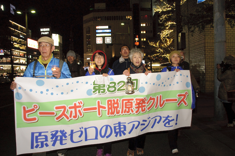 12月9日早朝、PEACE&GREEN BOAT 2012は博多港に帰港。クルーズはここで終了となりますが、ここでも脱原発や未来のエネルギーについて考えるさまざまなプログラムが実施されました。船を降り、北九州市東田地区で進められている次世代型エネルギー都市「スマートコミュニティ」を訪れました。そしてツアー後は博多へ戻り、今クルーズの締めくくりとなる、日韓共同脱原発キャンドルウォークに参加します。日本のみならず、日韓で、東アジア全体で原発ゼロを目指していこう——そんな思いを込めて博多の街を歩きます。それぞれが、思い思いの灯りを携え、原発のない世界へ向けて夜の博多を練り歩きました。