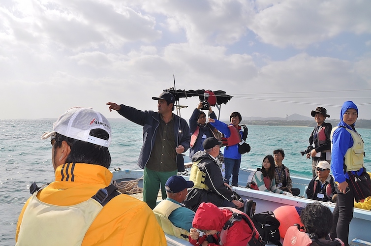沖縄の米軍基地問題について考えるツアー。訪れたのは、新基地建設問題に揺れる辺野古の海です。船に乗り込み沖へ。海から辺野古を見学します。沖縄らしい柔らかな色合いの海の向こうには、キャンプ・シュワブを望みます。美しい景色とのコントラストに複雑な思いで見つめていると、米軍の水陸両用戦車が船上からでもハッキリと聞こえるけたたましい音と黒煙を上げて、ビーチを疾走する一幕も。プログラムを終え「地元の人たちと出会って、基地問題は『他人事』じゃない『自分の問題』でもあると感じた」と語る参加者も。多くを学び、ひとりひとりが「自分にできること」を考える1日となりました。