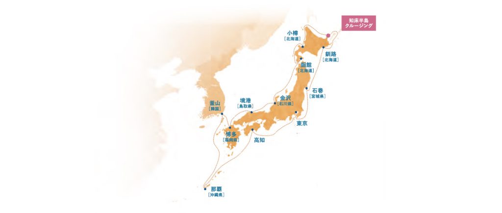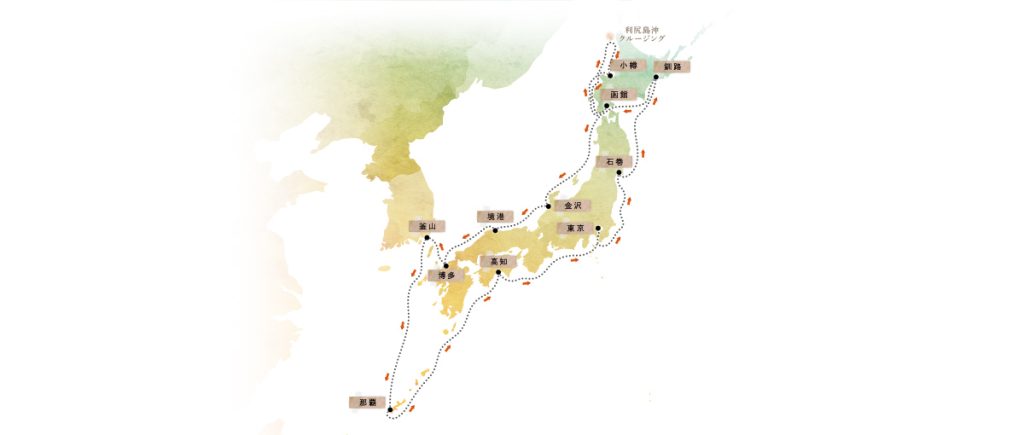 旅の始まりは東北・北海道から。南三陸の自然が広がる石巻や、この季節だけの風景が待つ北海道をめぐり、古都・金沢や九州一の観光都市・博多などを経由し、船は韓国第二の都市・釜山、そして沖縄の那覇へ。狭いようで広い日本の魅力を再発見する特別な旅が船出を迎えます。