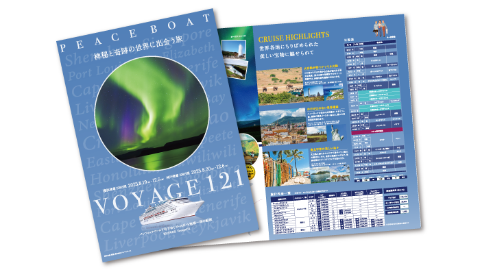 - 本サイトに掲載の写真は、お客様にピースボートクルーズのイメージをお伝えするものであり、過去に使用した別の客船で撮影された写真も含んでおります。また、季節に関わりなくすべて旅のイメージです。