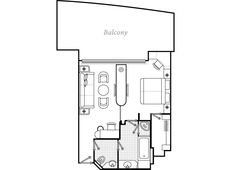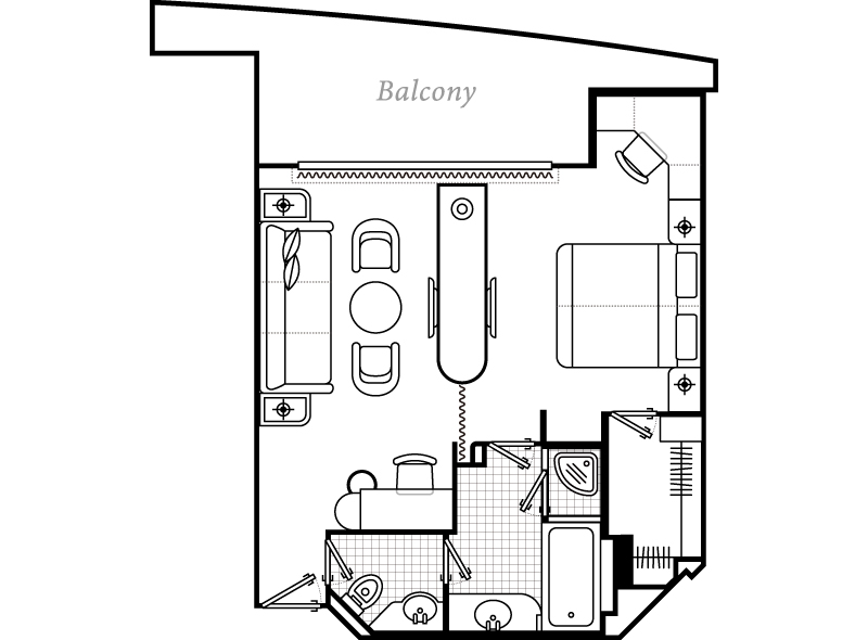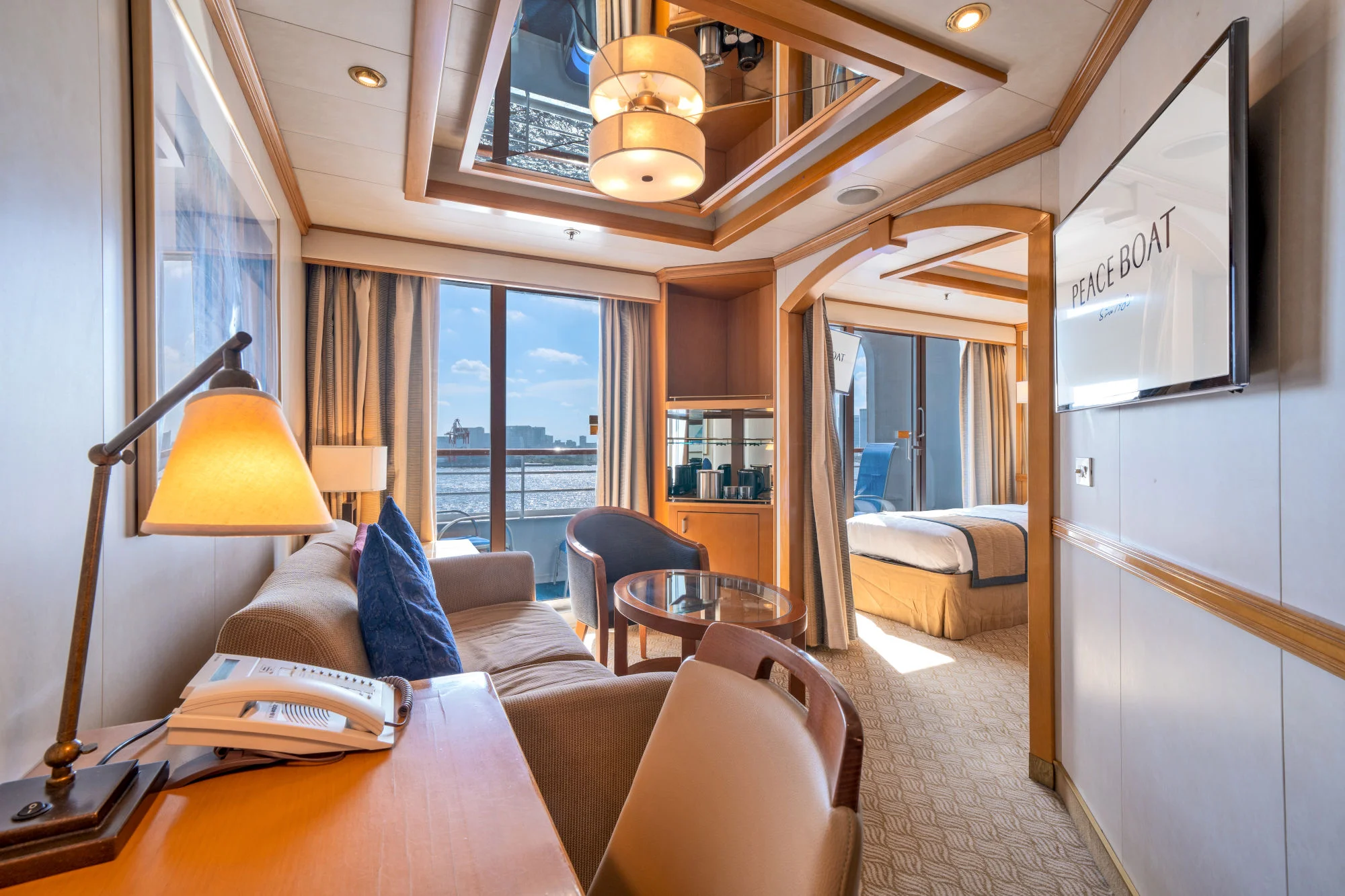 リビング、ベッドとエリアが分かれ、船旅ならではの優雅な時間をお過ごしいただけます。